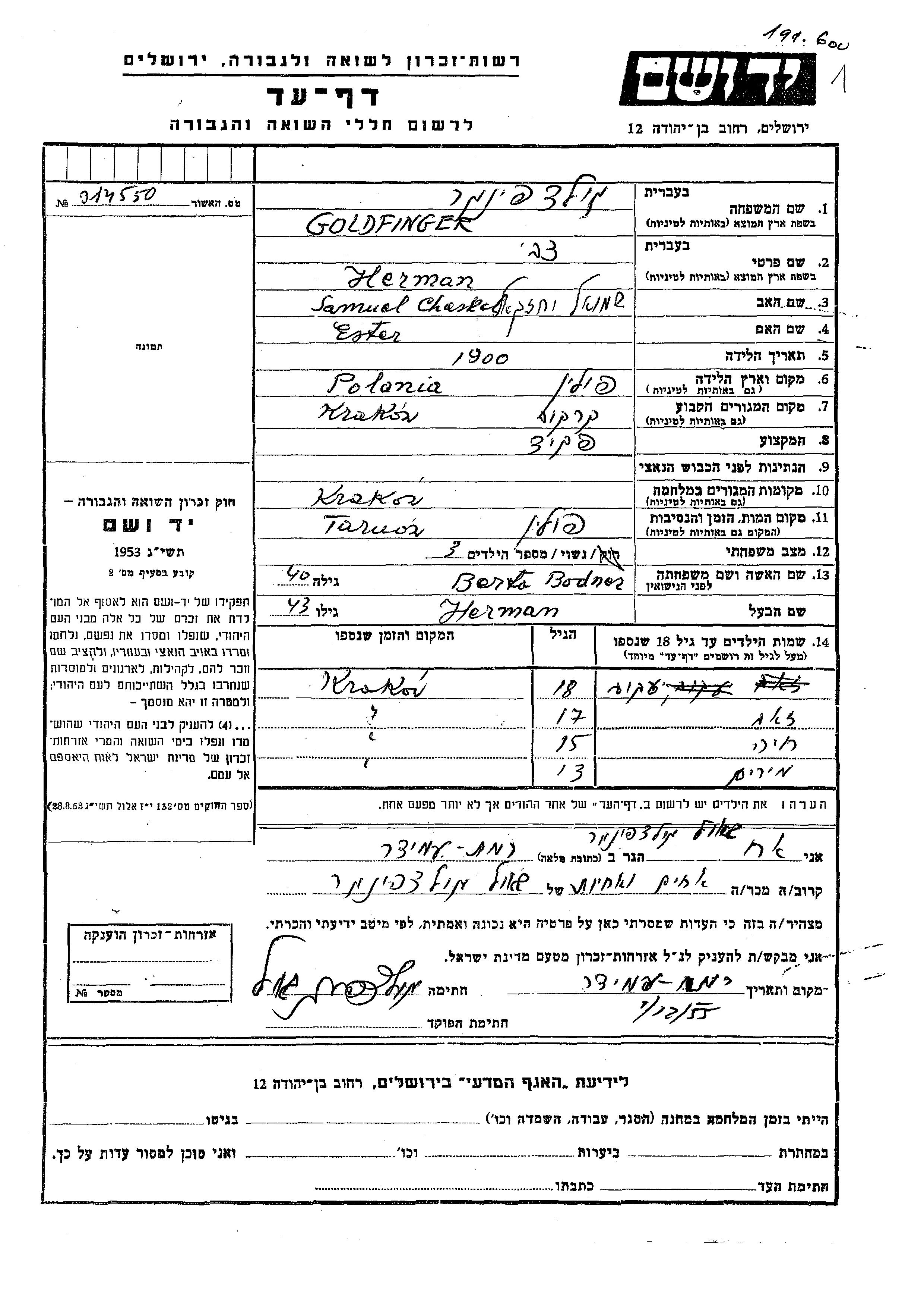 Zeev Goldfinger was born to Herman Tzvi and Berta nee Bodner. He was child. Prior to WWII he lived in Krakow, Poland. During the war he was in Krakow, Poland. Zeev was murdered in the Shoah.