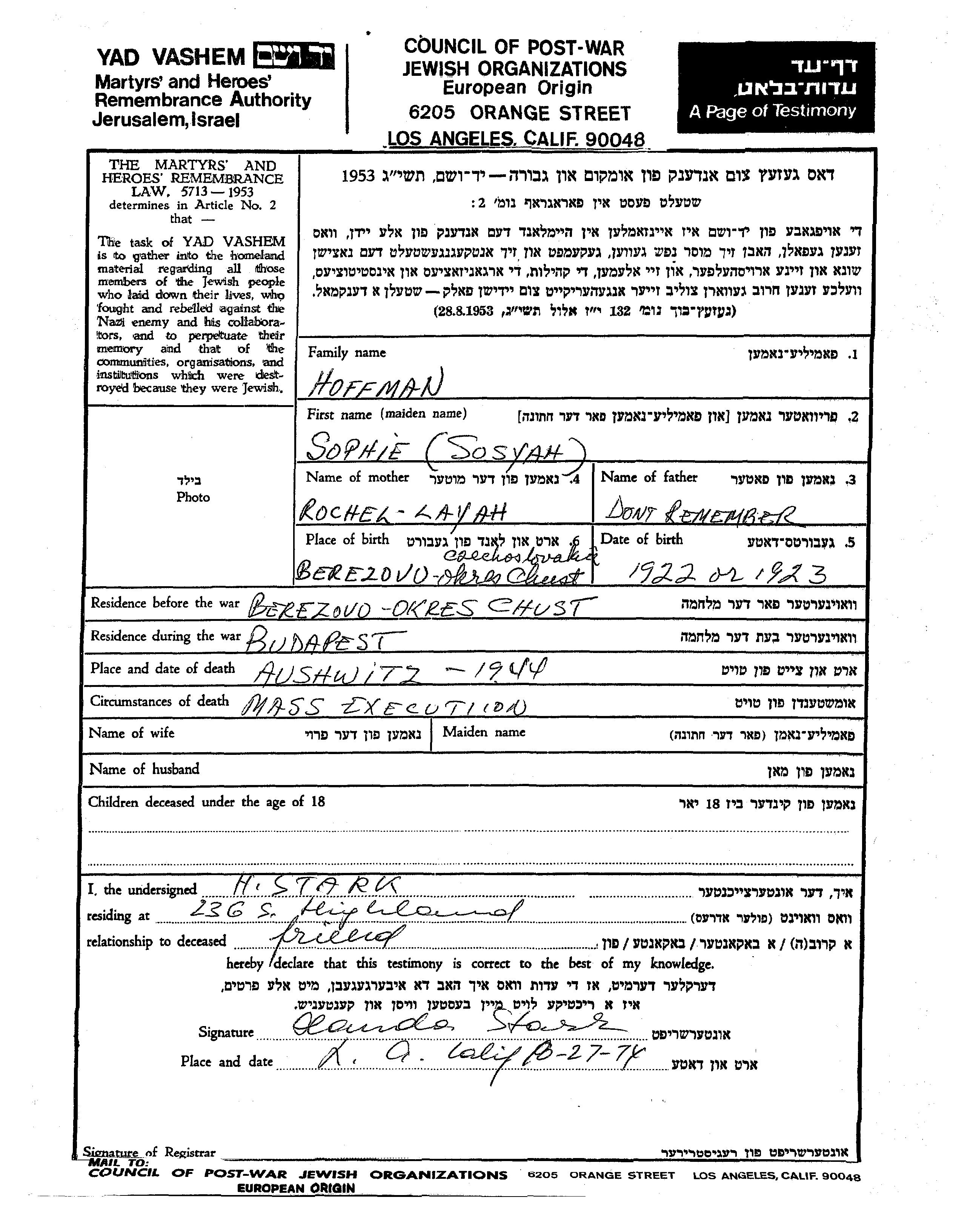 Hoffman Sophie Sosyah 1922 Berezovo, Czechoslovakia Page of Testimony