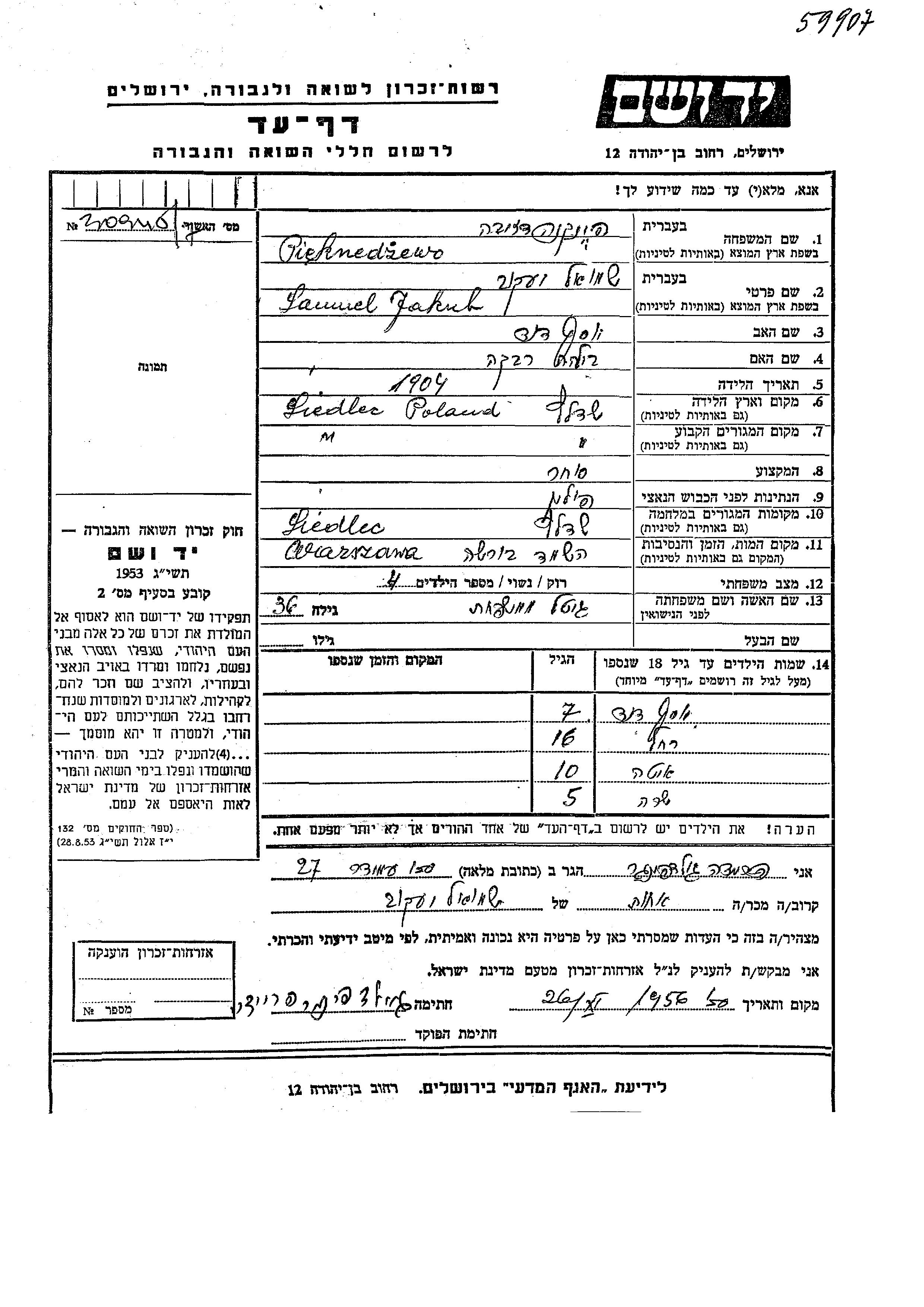 Yosef David Pieknedzewo was born to Yakub Shmuel and Gitel. He was child. Prior to WWII he lived in Siedlce, Poland. During the war he was in Siedlce, Poland. Yosef David was murdered in the Shoah.