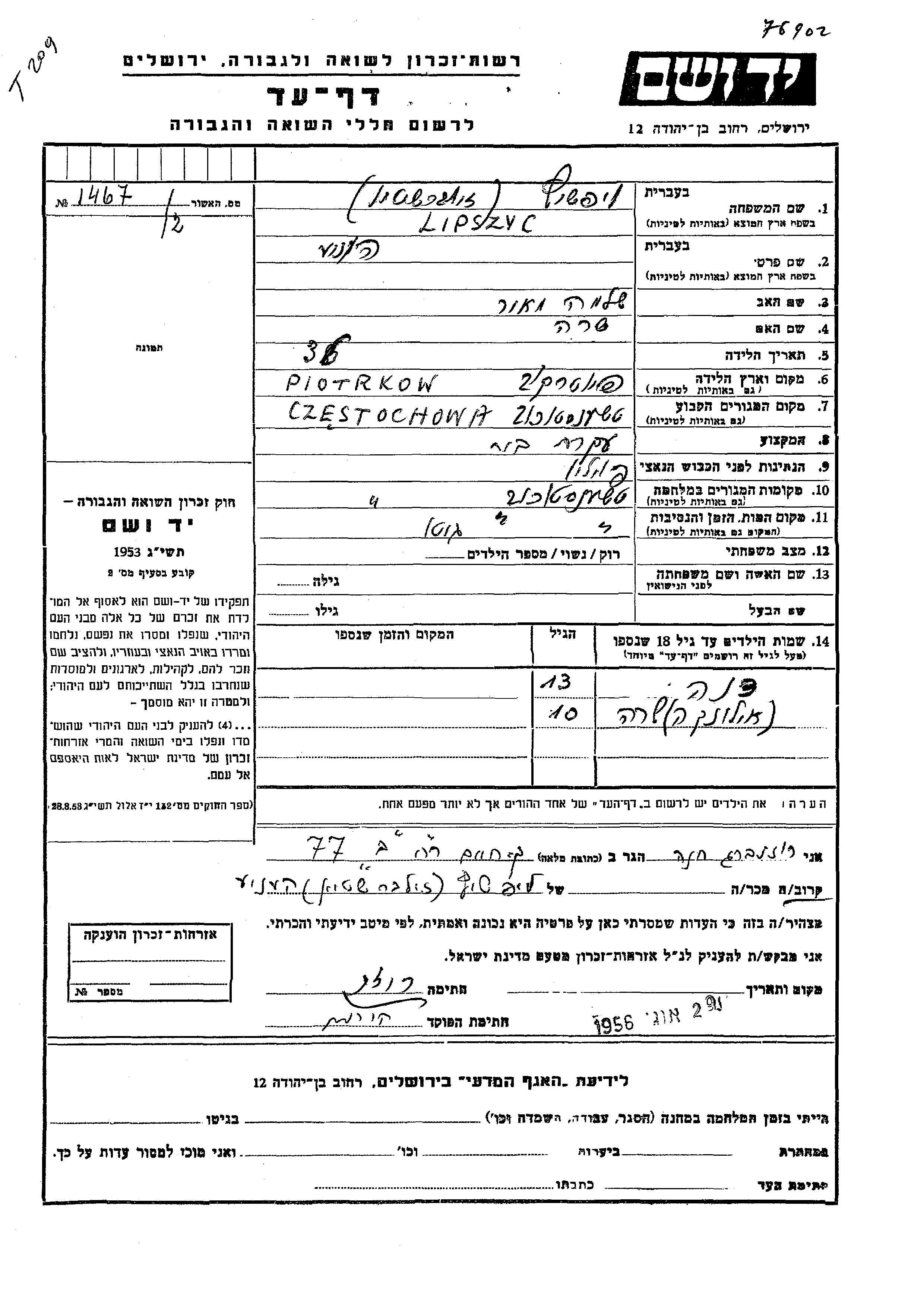 Ilonka Sara Lipszyc was born to Henie nee Zilbershtein. She was child. Prior to WWII she lived in Czestochowa, Poland. During the war she was in Czestochowa, Poland. Ilonka Sara was murdered in the Shoah.