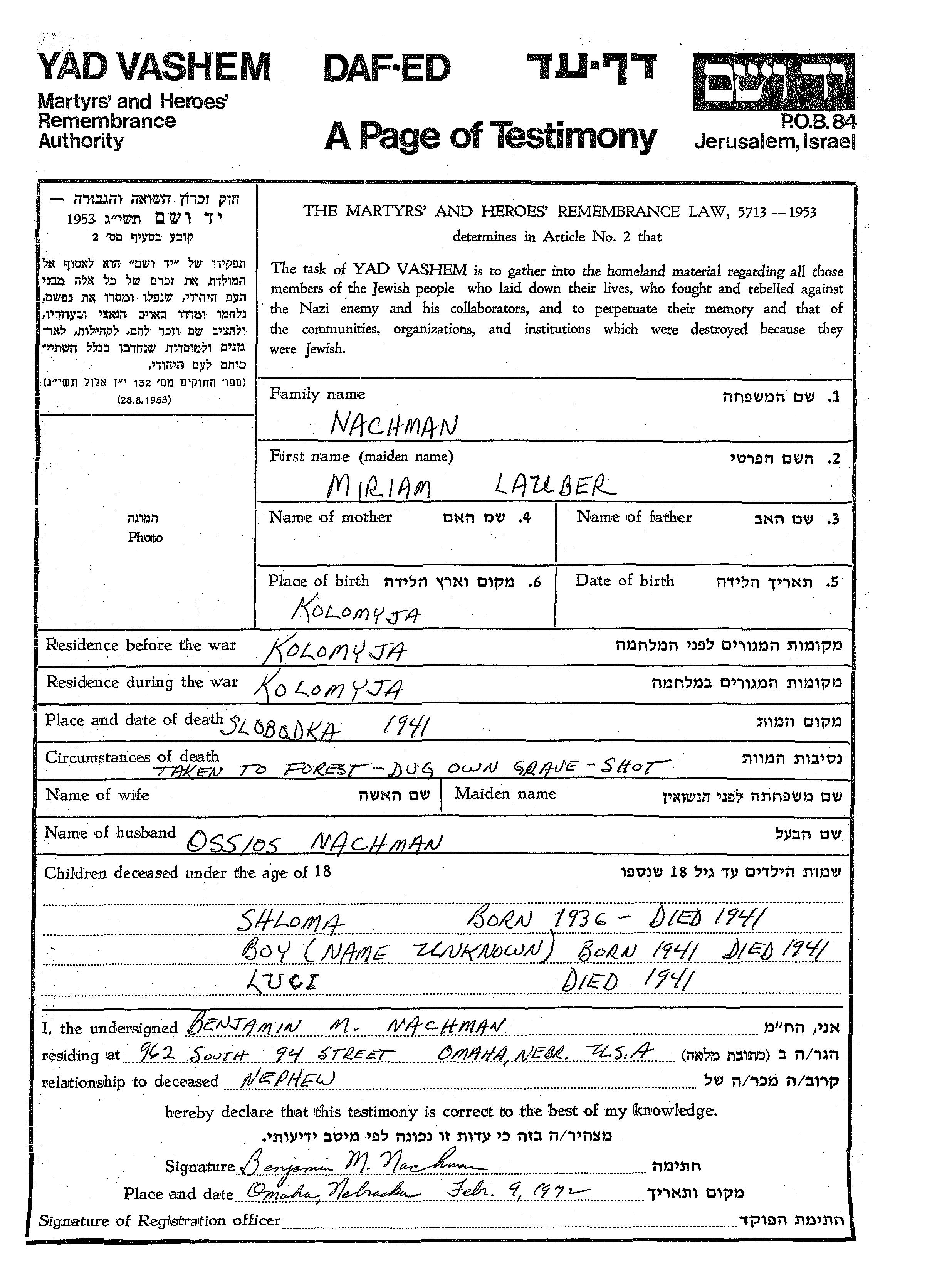 Nachman First name unknown 1941 Kolomyja, Poland Page of Testimony