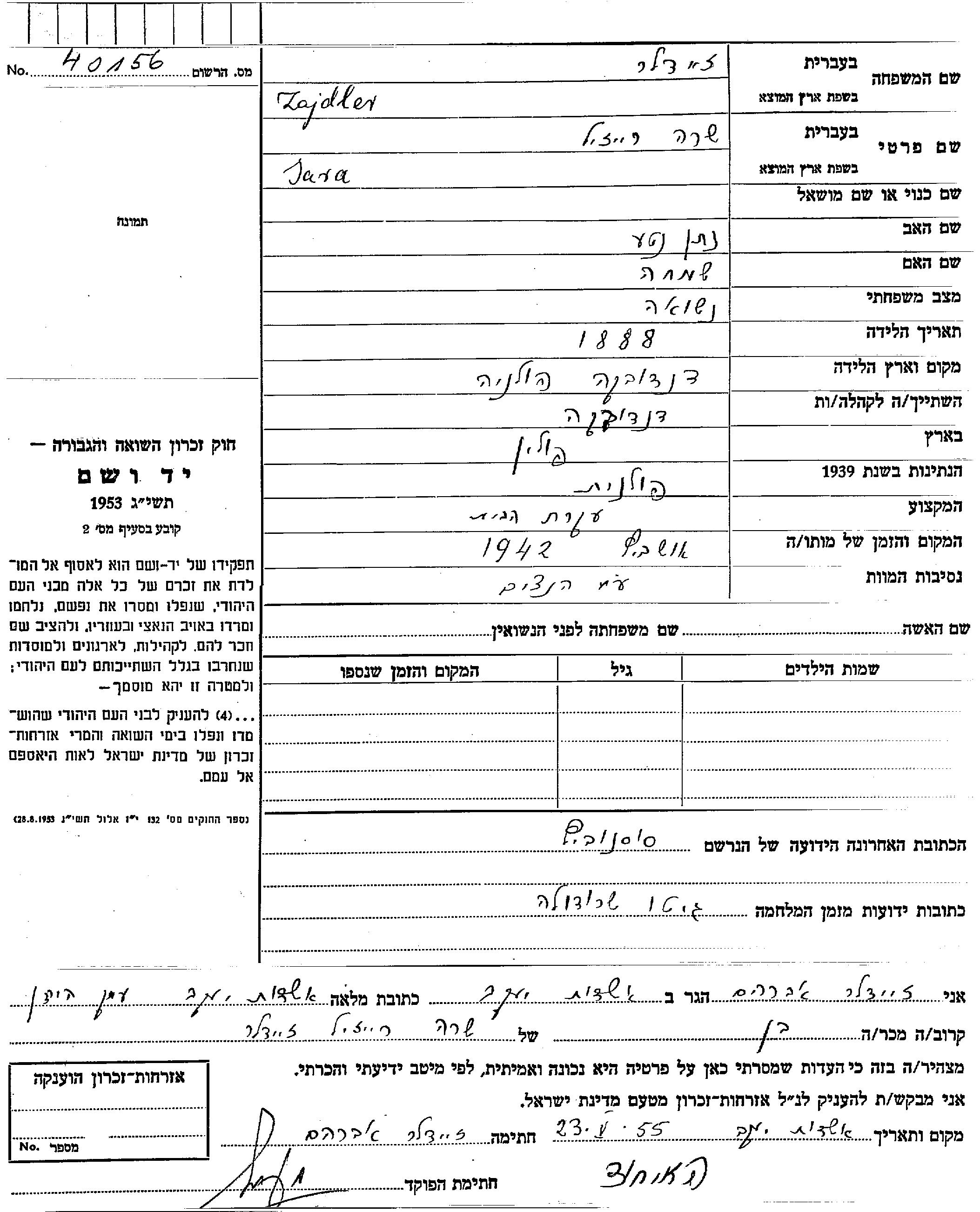 Sara Reizil Zajdler was born in Dandowka, Poland, 1888 to Natan Nute and Simkha. She was a housewife and married. Prior to WWII she lived in Sosnowce, Poland. During the war she was in Srodola, Poland. Sara Reizil was murdered in the Shoah. Place of death: Auschwitz, Poland, 1942.
