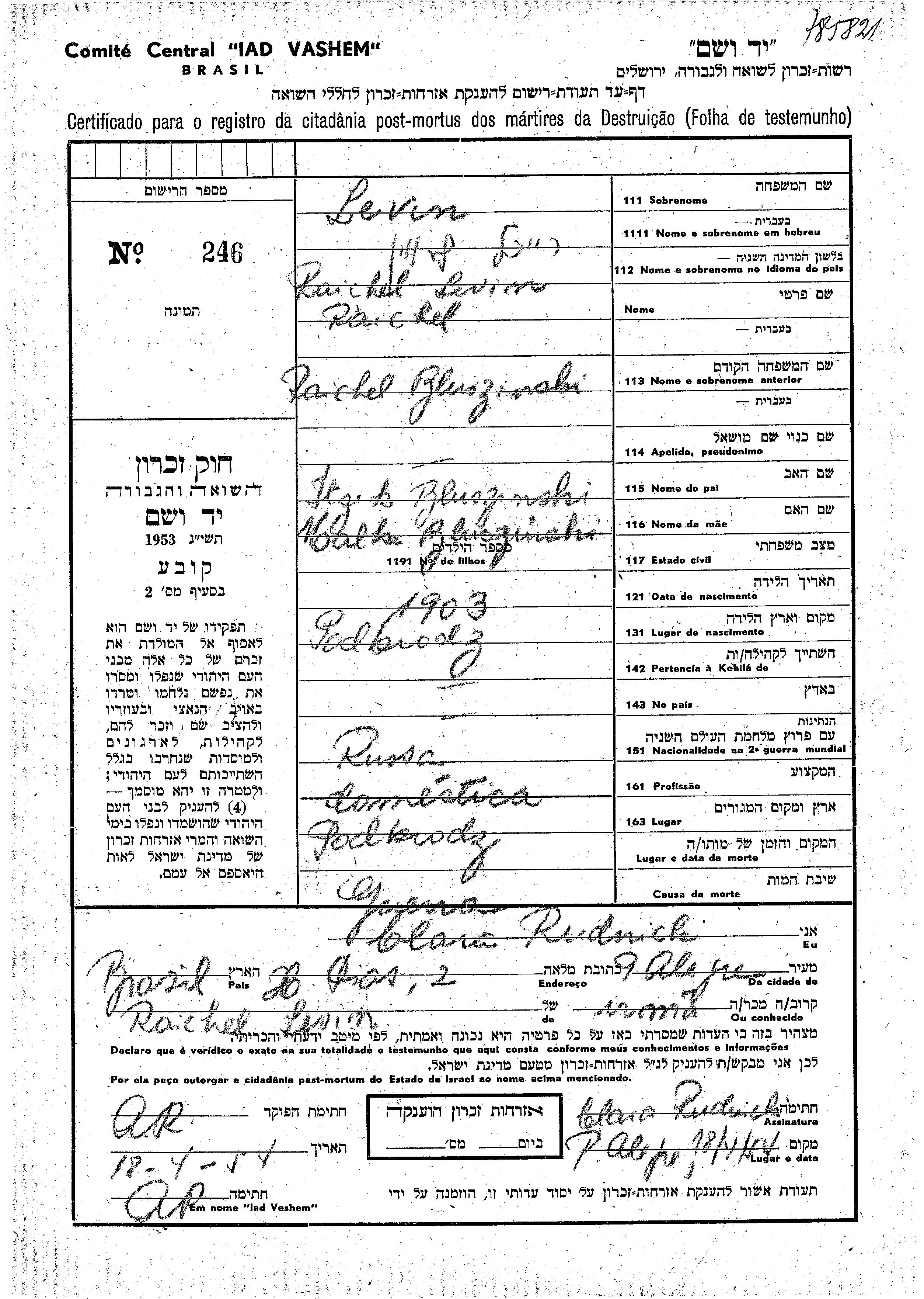 Levin Raichel 1903 Podbrodz, Poland Page of Testimony