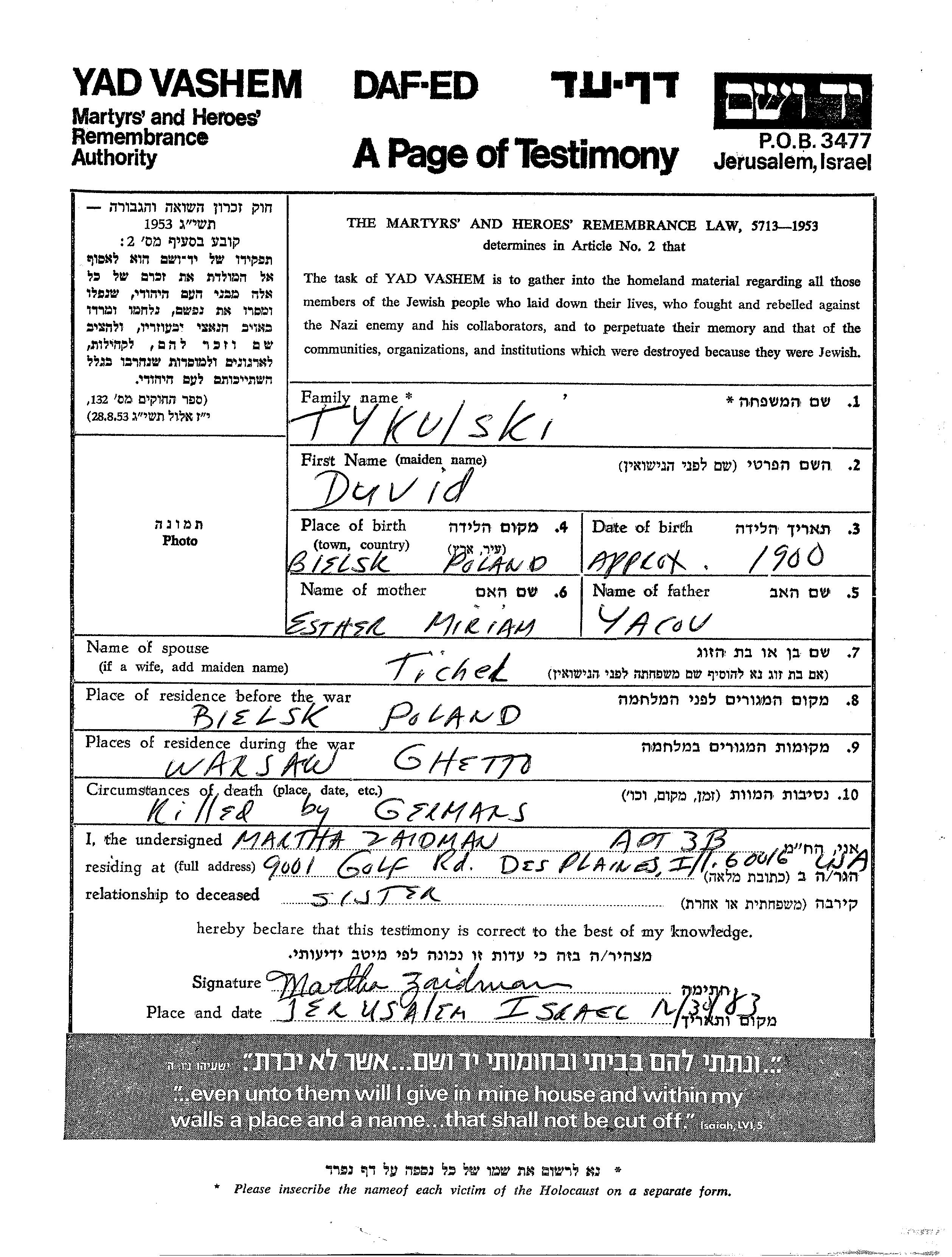 Duvid Tykulski was born in Bielsk, Poland, 1900 to Yacov and Esther Miriam. He was married to Tichel. Prior to WWII he lived in Bielsk, Poland. During the war he was in Warsaw, Poland. Duvid was murdered in the Shoah.