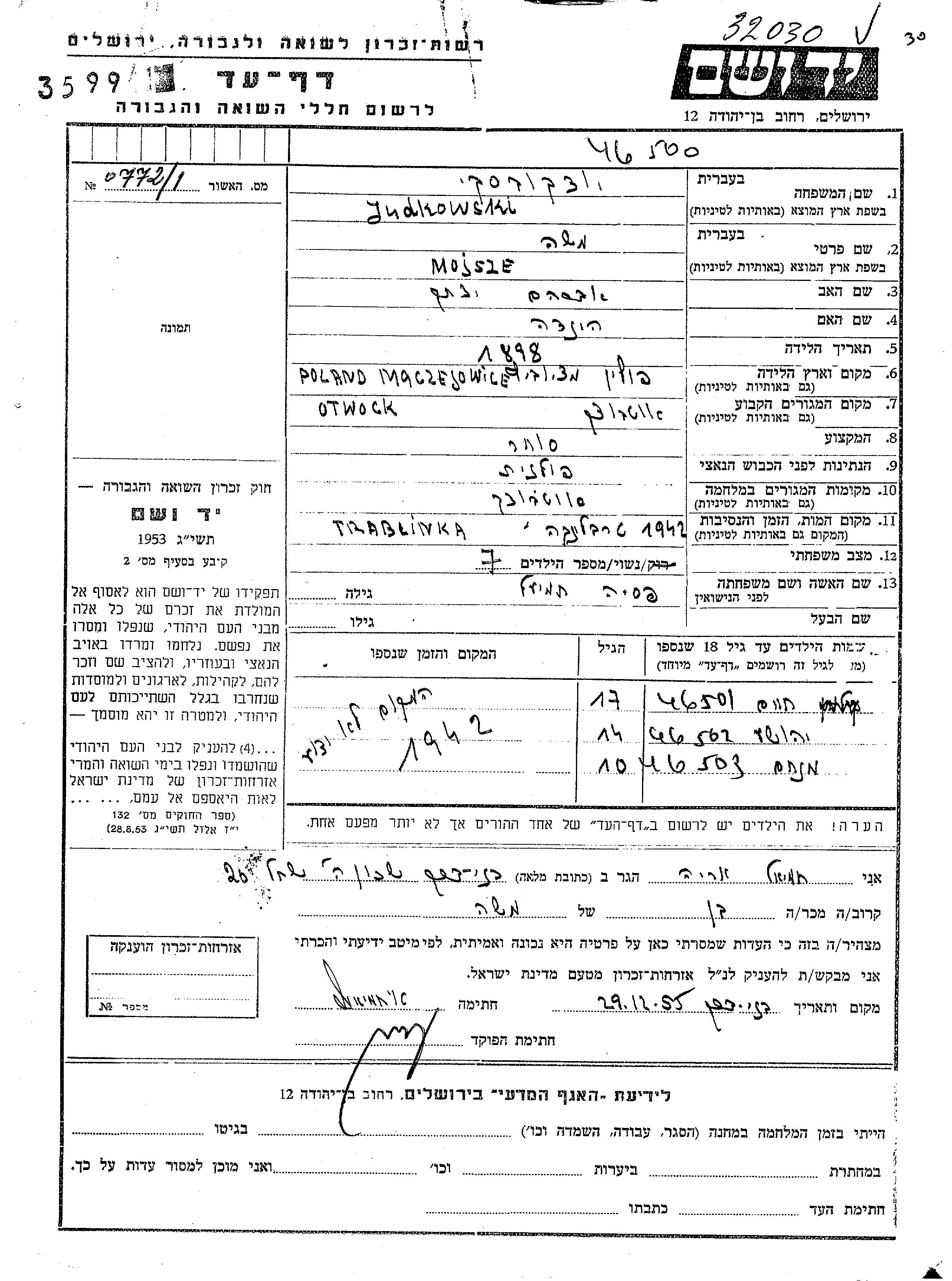 Mojsze Judkowski was born in Maciejowice, Poland, 1898 to Avraham Yitzkhak and Hinda. He was a merchant and married to Pesia nee Khmiel. Prior to WWII he lived in Otwock, Poland. During the war he was in Otwock, Poland. Mojsze was murdered in the Shoah. Place of death: Treblinka, Poland, 1942.