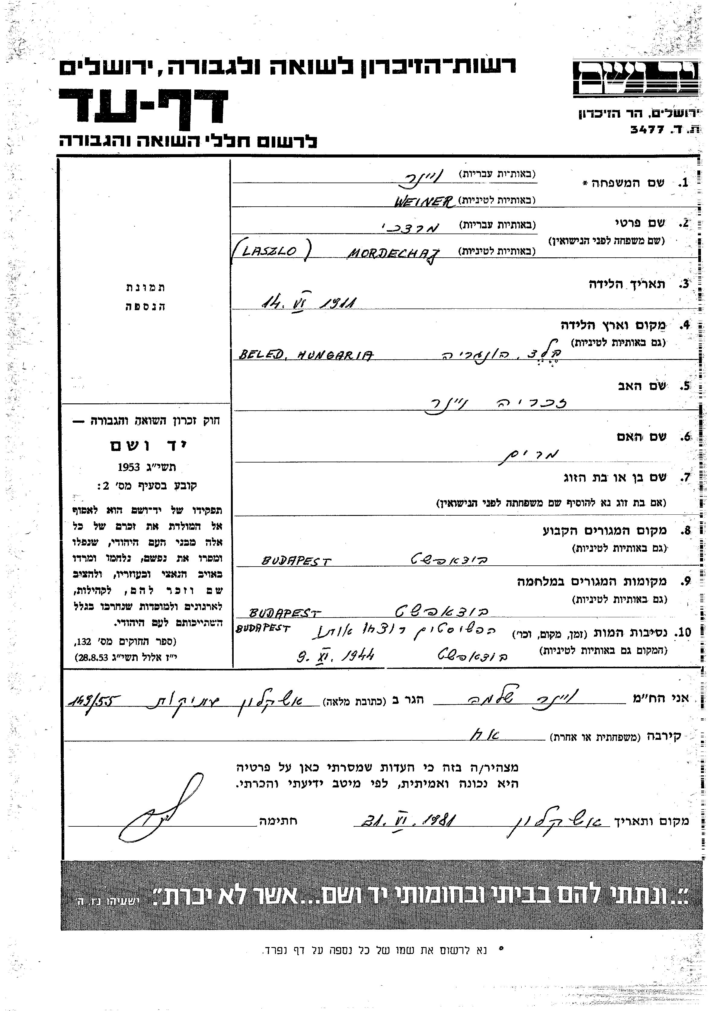 Weiner Mordechaj Laszlo 1911 Budapest, Hungary Page of Testimony