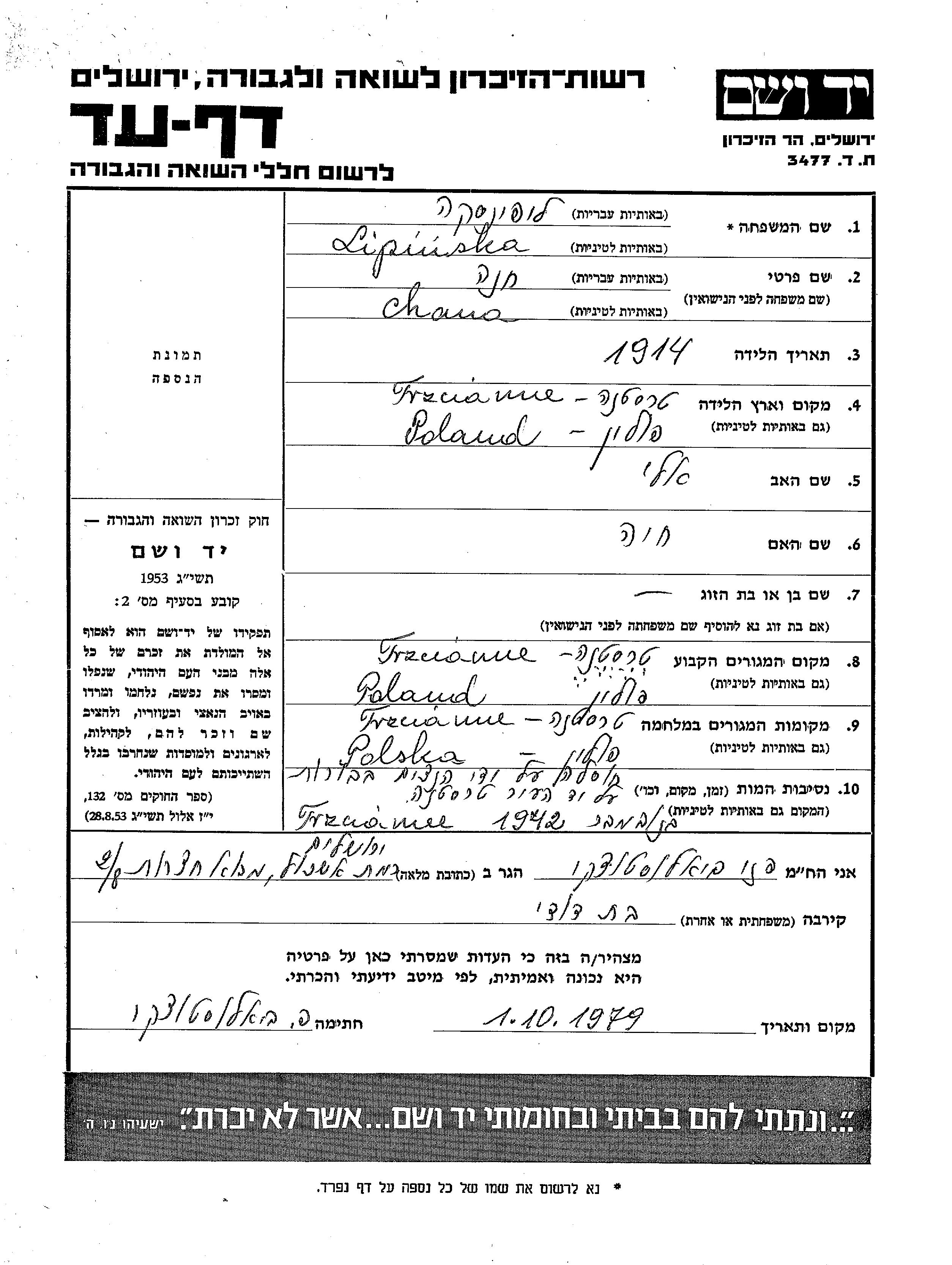 Chana Lipinska was born in Trzcianne, Poland, 1914 to Eli and Khaia. Prior to WWII she lived in Trzcianne, Poland. During the war she was in Trzcianne, Poland. Chana was murdered in the Shoah. Place of death: Trzcianne, Poland, 11/1942.
