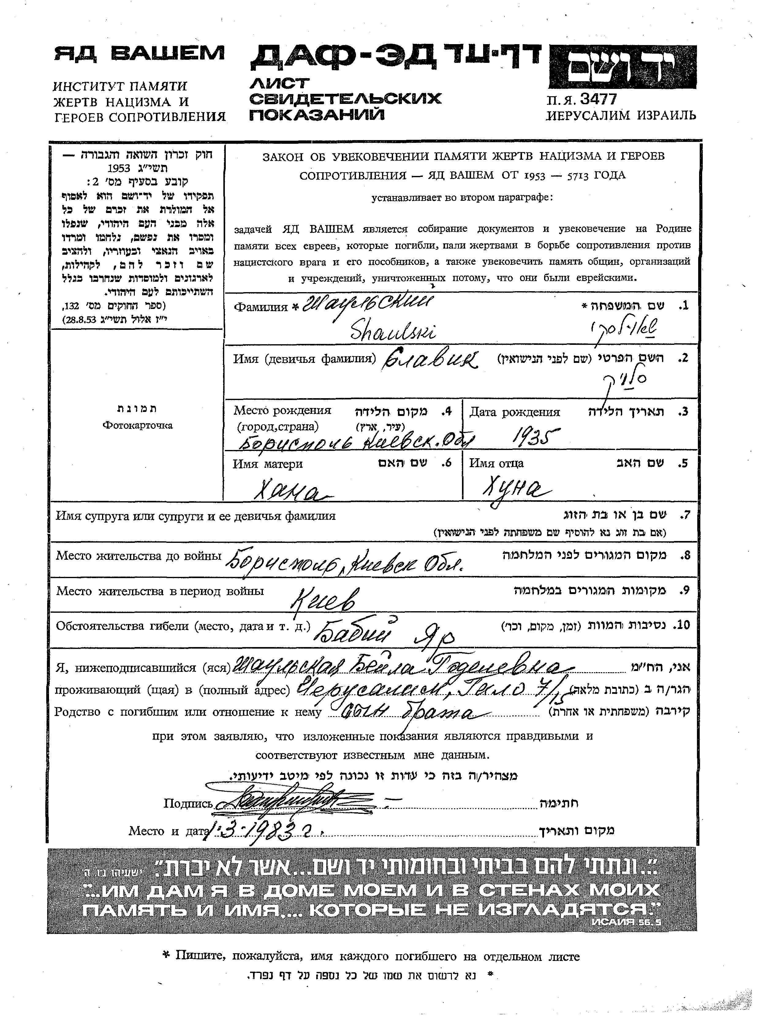 Shaulski Slavik 1935 Borispol, Ukraine (USSR) Page of Testimony