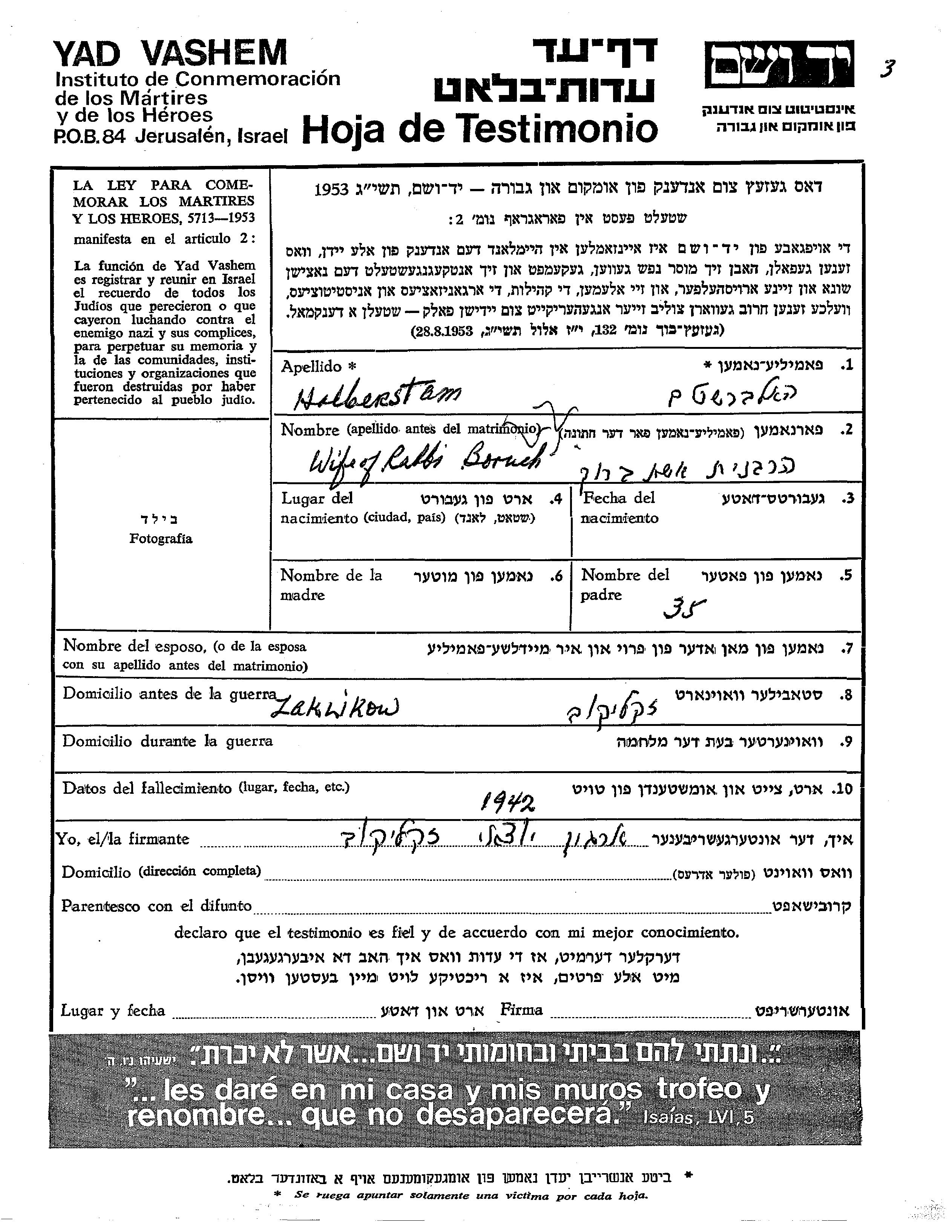 Halberstam First name unknown Zaklikow, Poland Page of Testimony