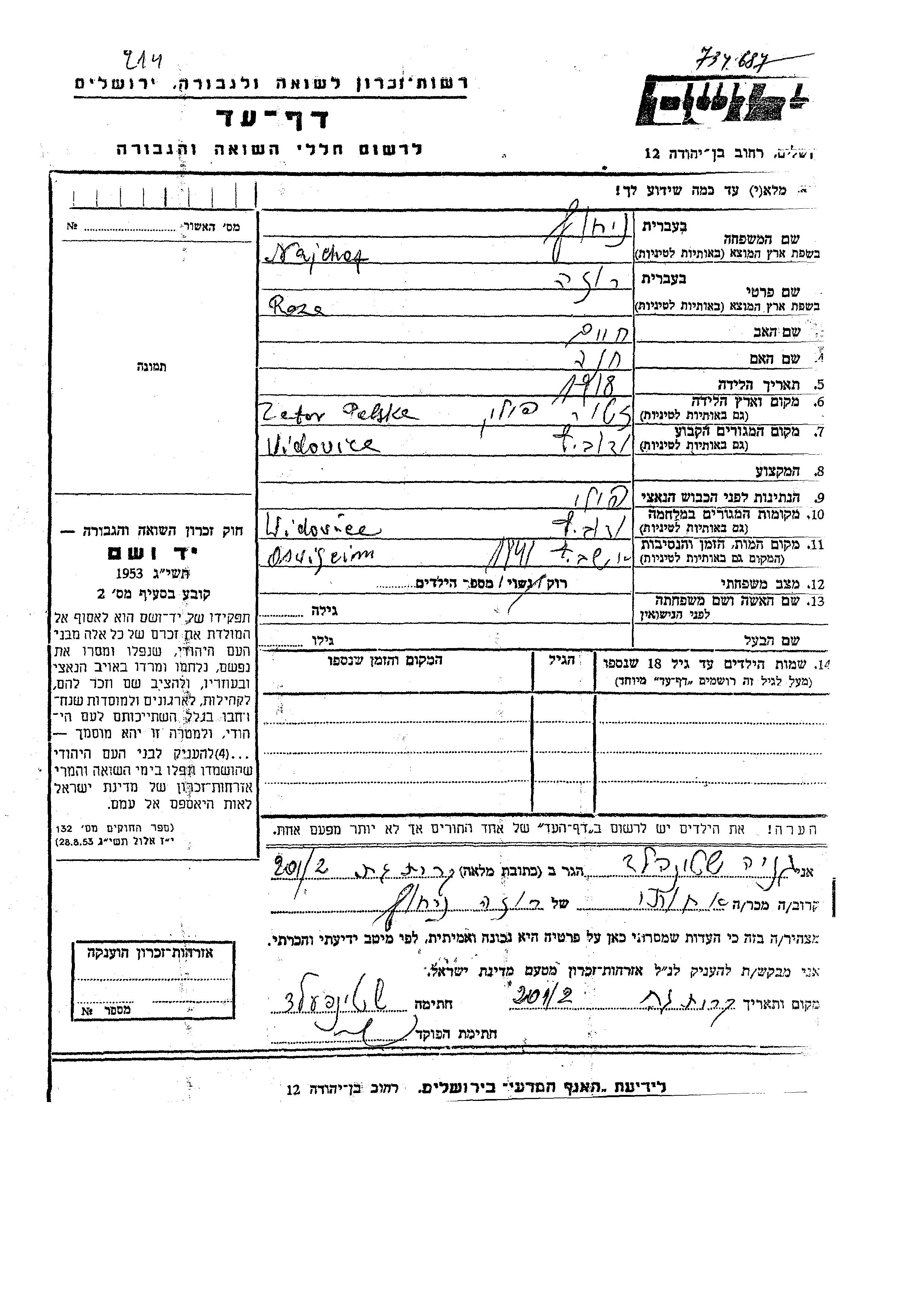 Roza Najchof was born in Zator, Poland, 1918 to Khaim and Khana. She was single. Prior to WWII she lived in Wadowice, Poland. During the war she was in Wadowice, Poland. Roza was murdered in the Shoah. Place of death: Auschwitz, Poland, 1941.