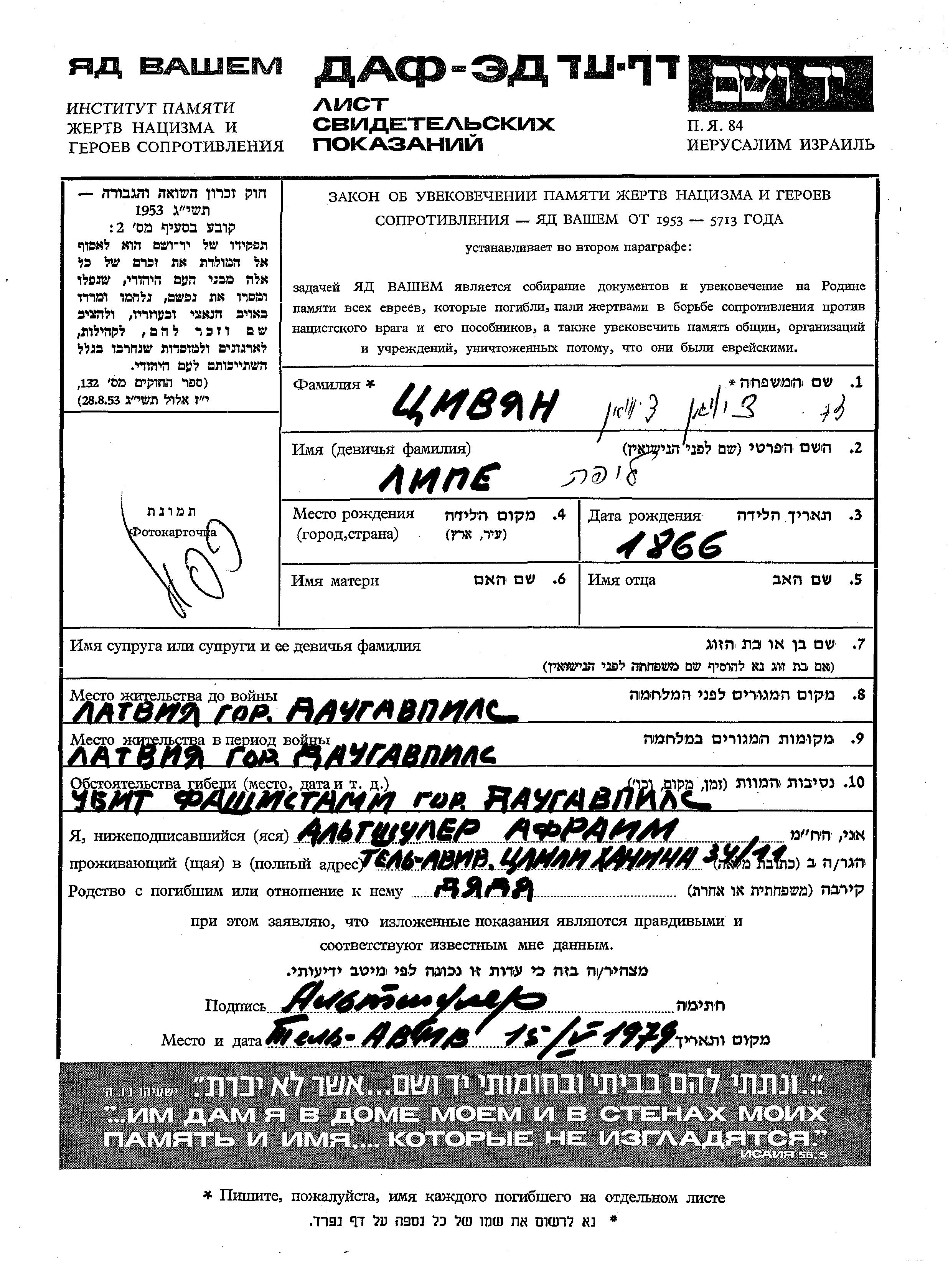 Lipe Tzivyan was born, 1866. He was married. Prior to WWII he lived in Daugavpils, Latvia. During the war he was in Daugavpils, Latvia. Lipe was murdered in the Shoah. Place of death: Daugavpils, Latvia.