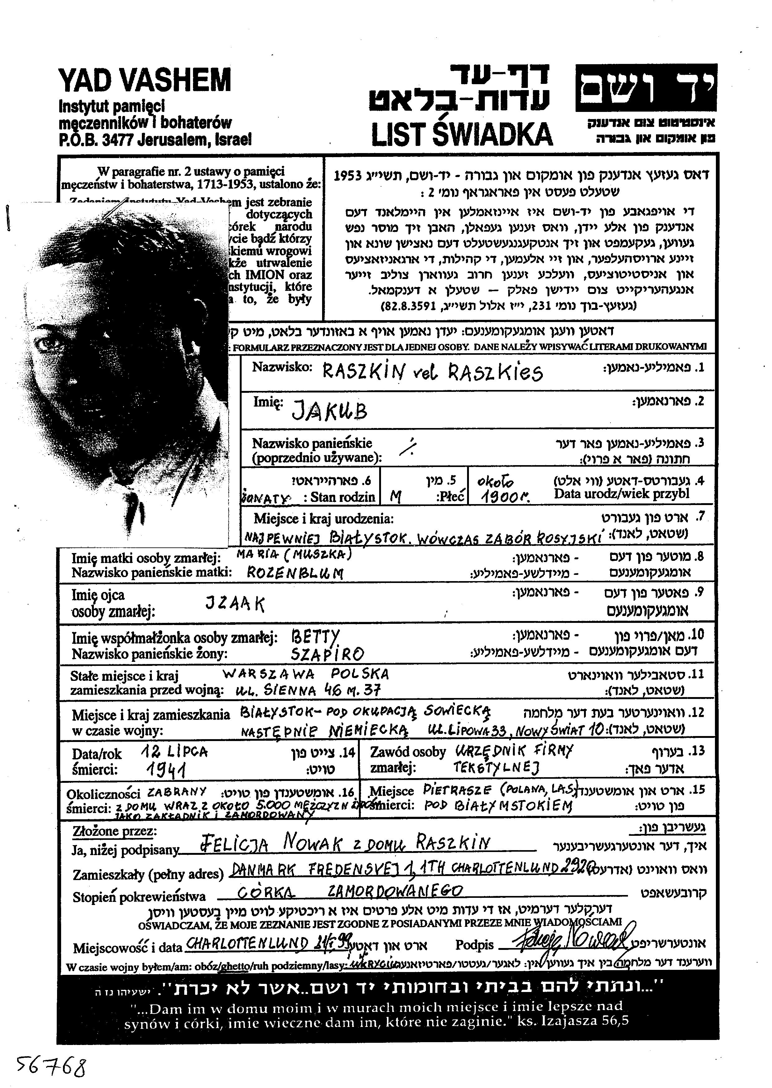 Raszkin Raszkies Jakub 1900 Warszawa, Poland Page of Testimony