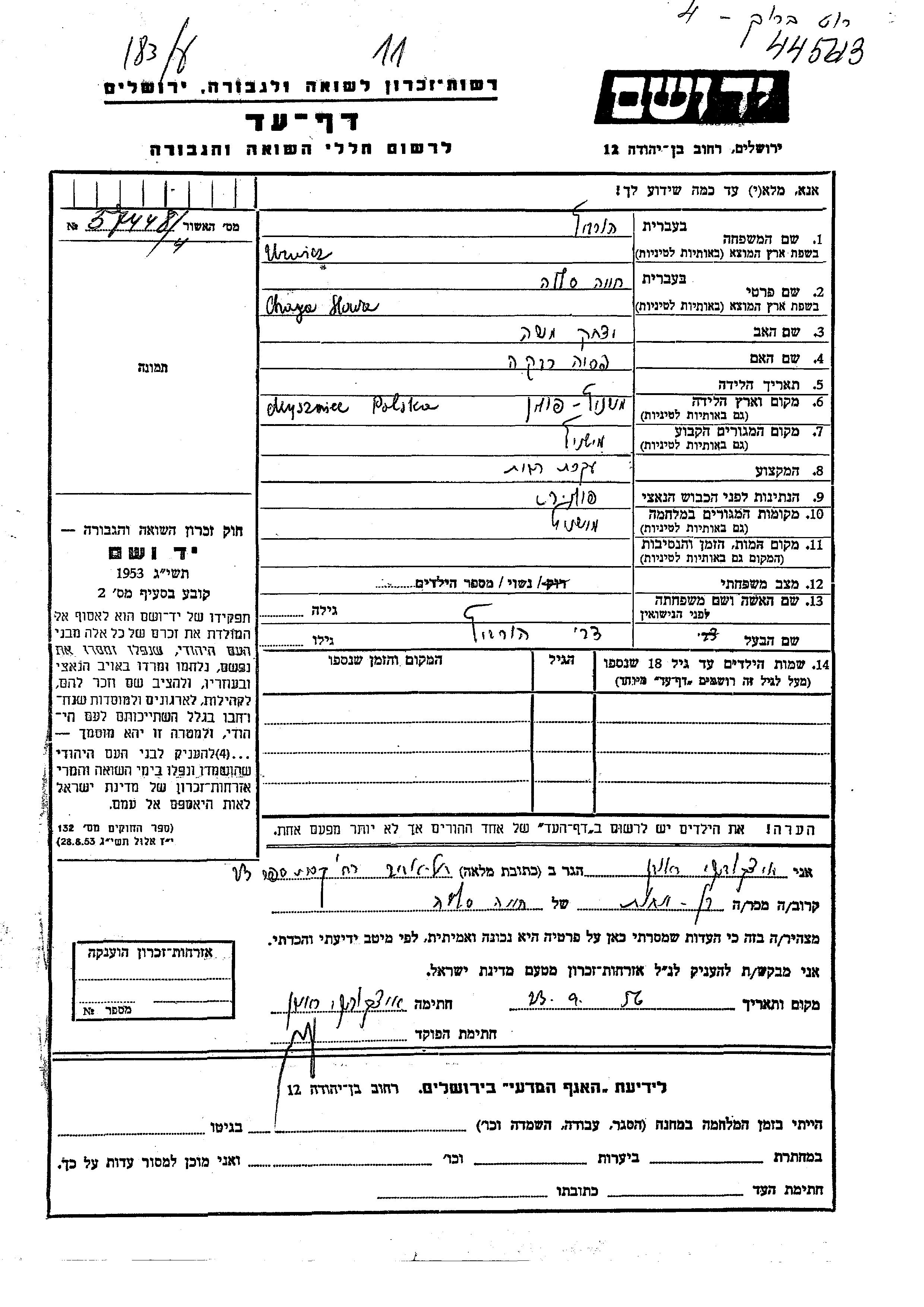 Chaya Slowa Khava Urwicz Hurvitz was born in Myszyniec, Poland to Yitzkhak Moshe and Pesia Rivka. She was a housewife and married to Tzvi. Prior to WWII she lived in Myszyniec, Poland. During the war she was in Myszyniec, Poland. Chaya Slowa Khava was murdered in the Shoah.