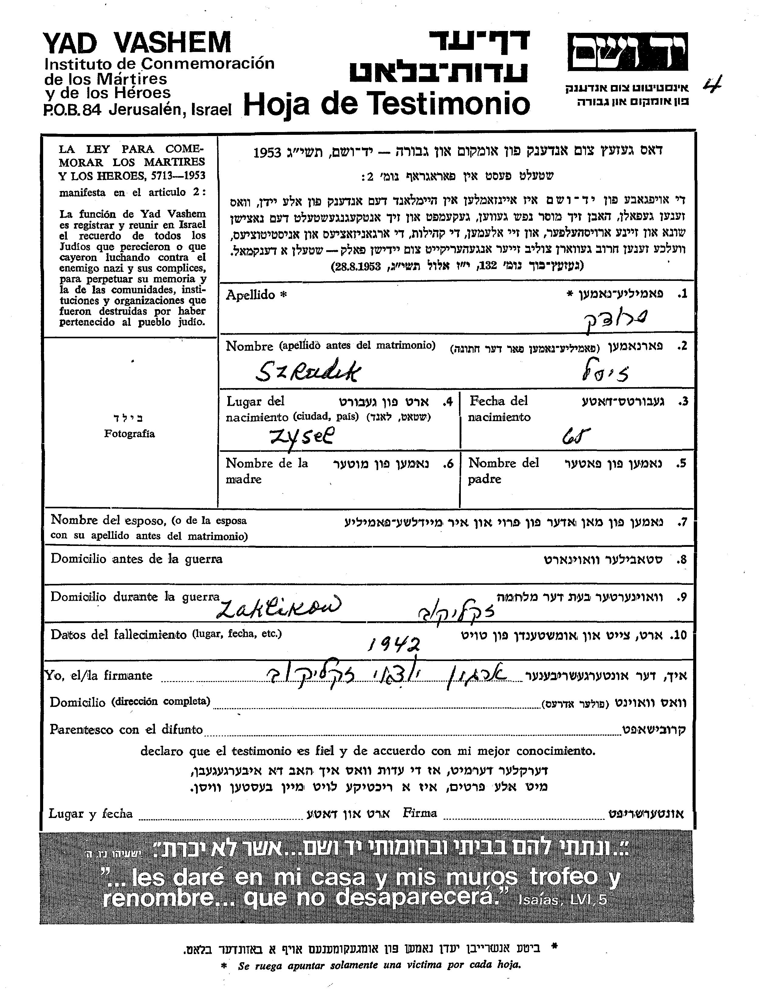 Szrudek Zysel Zysl unstated place, Page of Testimony