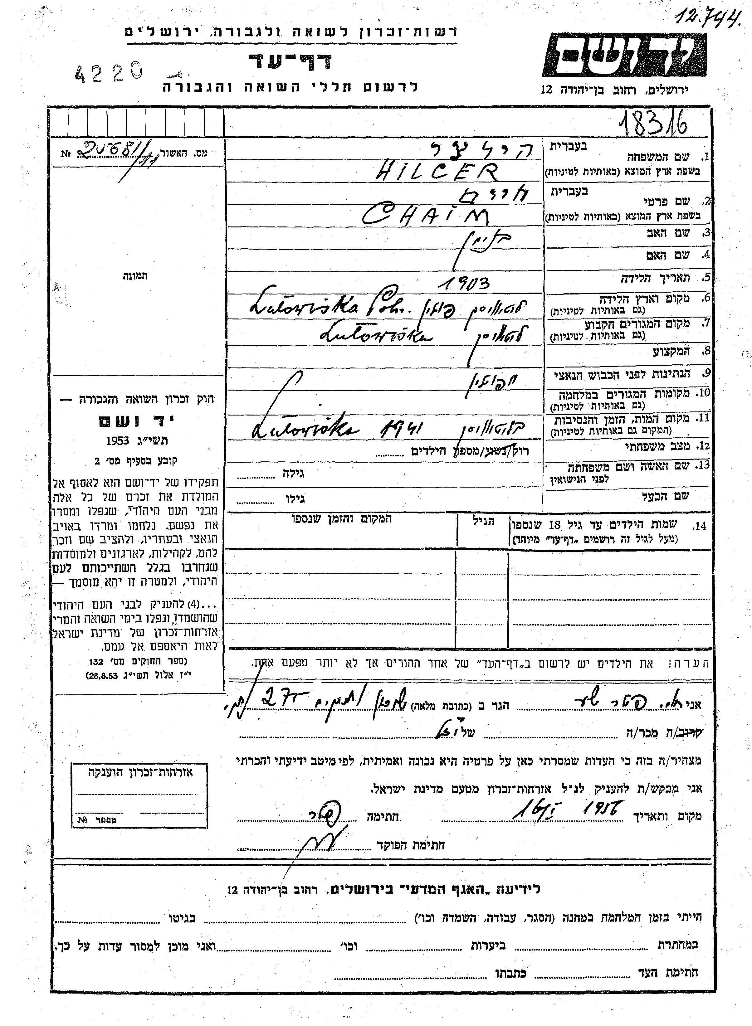 Chaim Hilcer was born in Lutowiska, Poland, 1903 to Beniamin. He was married. Prior to WWII he lived in Lutowiska, Poland. Chaim was murdered in the Shoah. Place of death: Lutowiska, Poland, 1941.