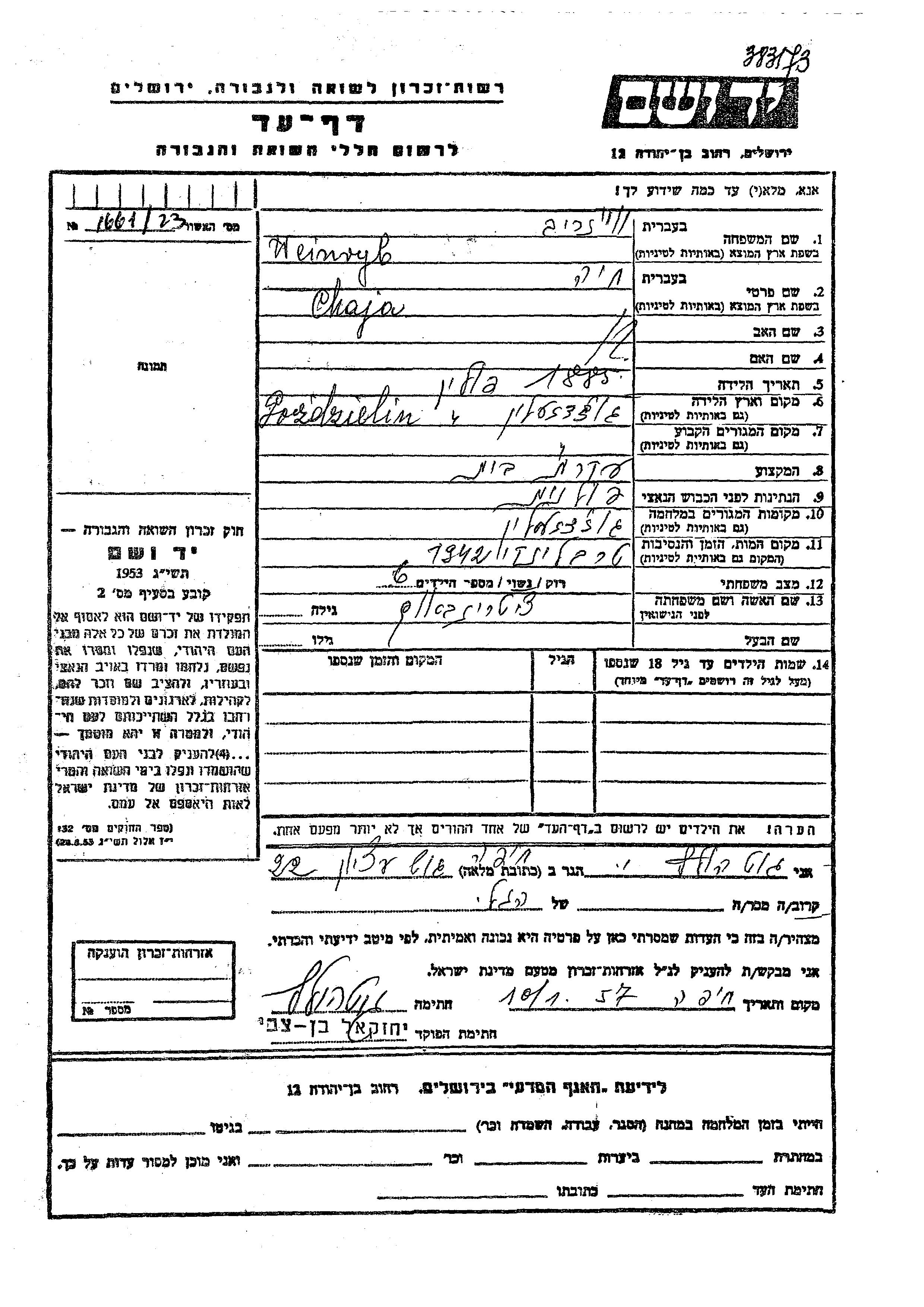Chaya Weinryb nee Tzitrinbaum was born in Gozdzielin, Poland, 1885. She was a housewife and married. During the war she was in Gozdzielin, Poland. Chaya was murdered in the Shoah. Place of death: Treblinka, Poland, 1942.