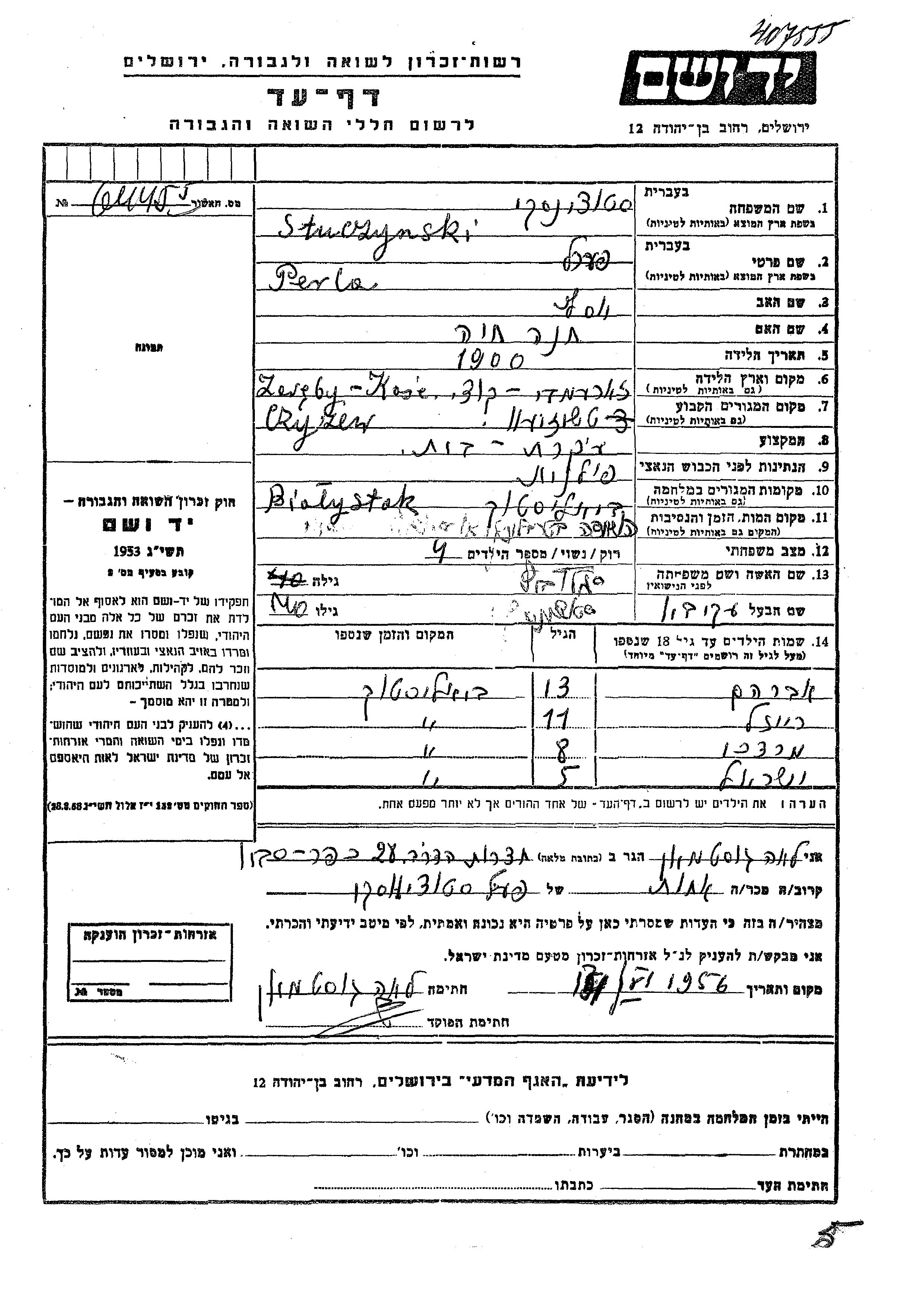 Perla Stuczynski nee Samulevitz was born in Zareby Koscielne, Poland, 1900 to Yosef and Khana Khaia. She was a housewife and married to Akiva. Prior to WWII she lived in Czyzew, Poland. During the war she was in Bialystok, Poland. Perla was murdered in the Shoah. Place of death: Treblinka, Poland.