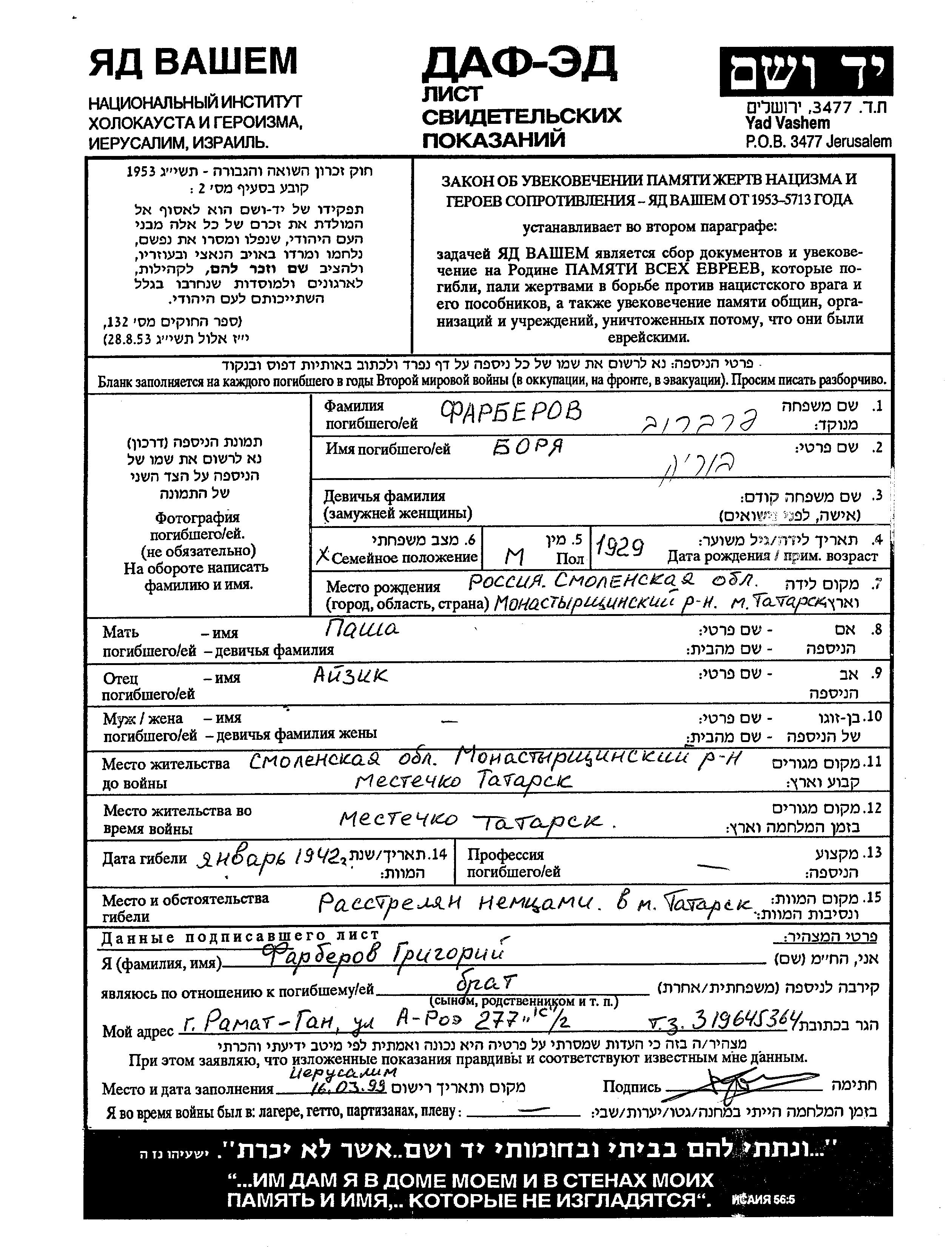 Borya Farberov was born in Tatarsk, Russia (USSR), 1929 to Ayzik and Pasha. He was single. Prior to WWII he lived in Tatarsk, Russia (USSR). During the war he was in Tatarsk, Russia (USSR). Borya was murdered in the Shoah. Place of death: Tatarsk, Russia (USSR), 01/1942.