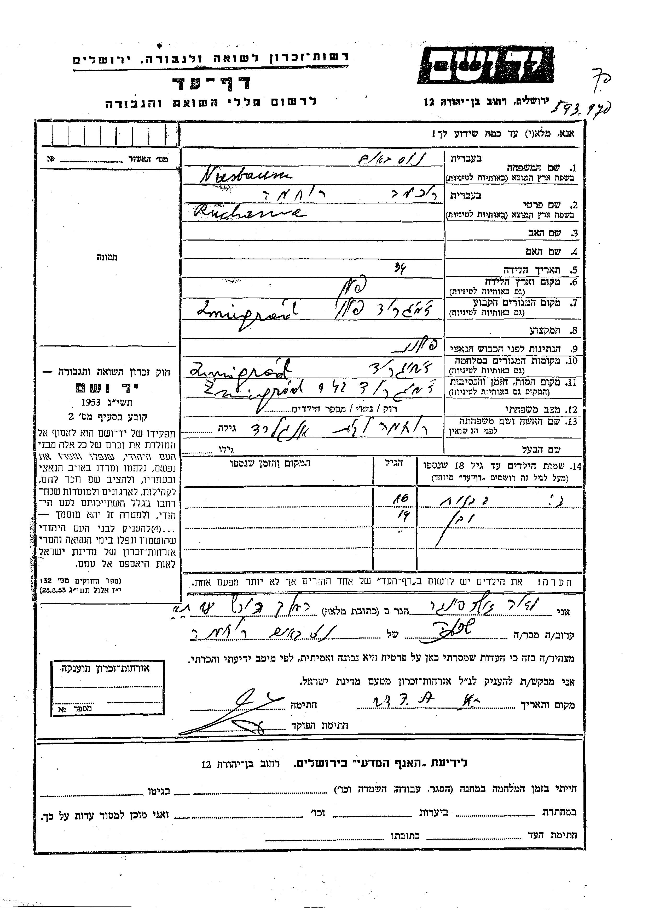 Nusbaum First name unknown Zmigrod, Poland Page of Testimony