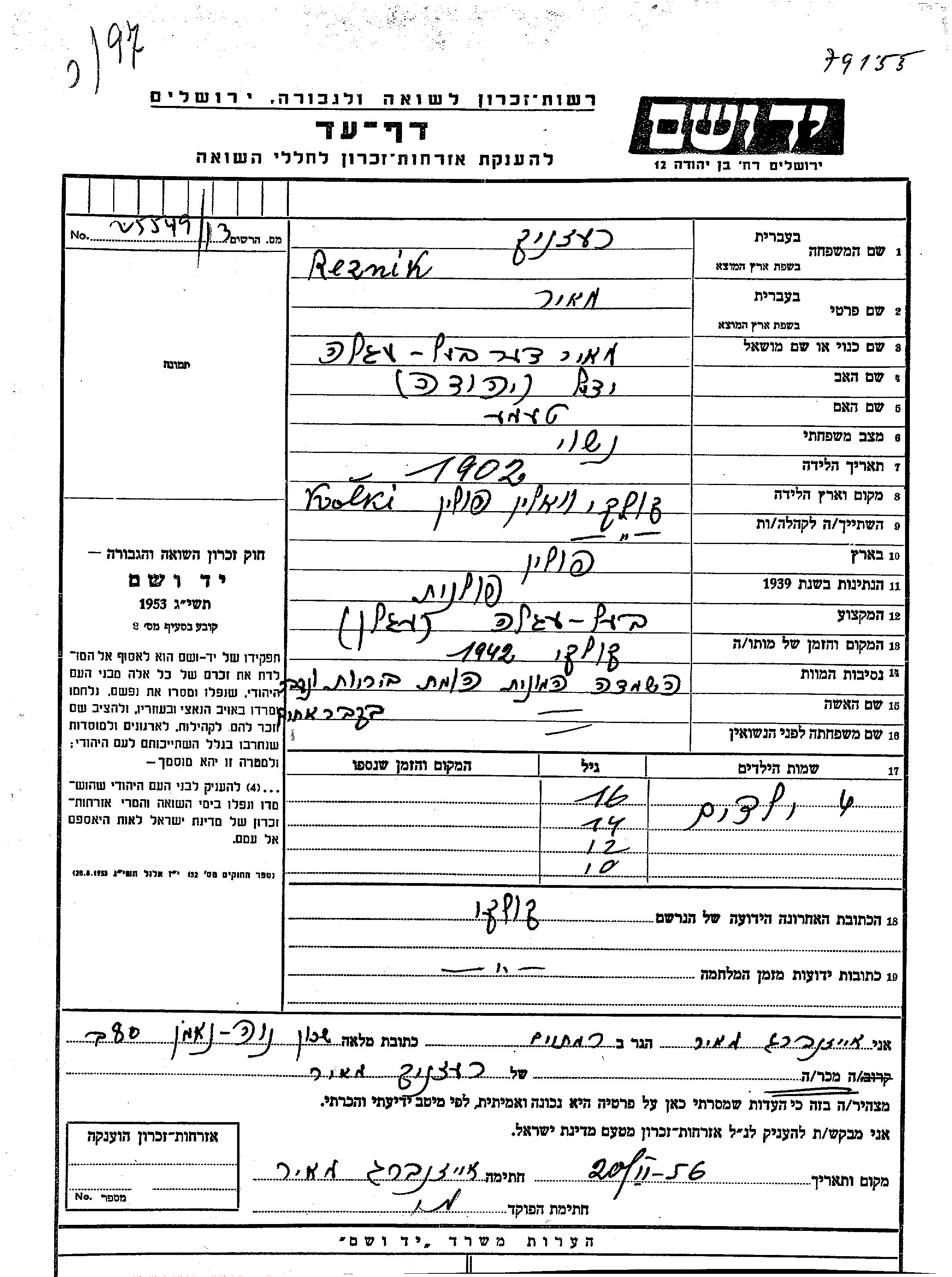 Reznik First name unknown Kołki, Poland Page of Testimony