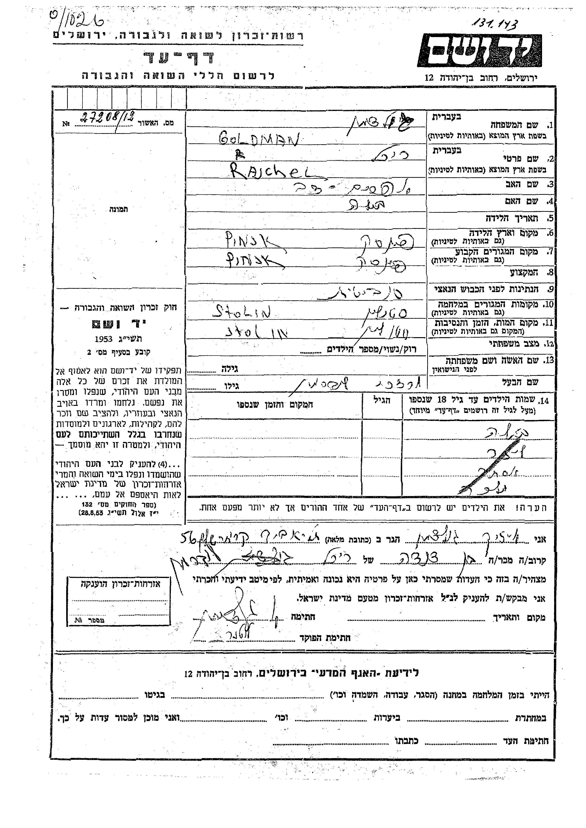 Yad Vashem - Pages of Testimony Names Memorial Collection