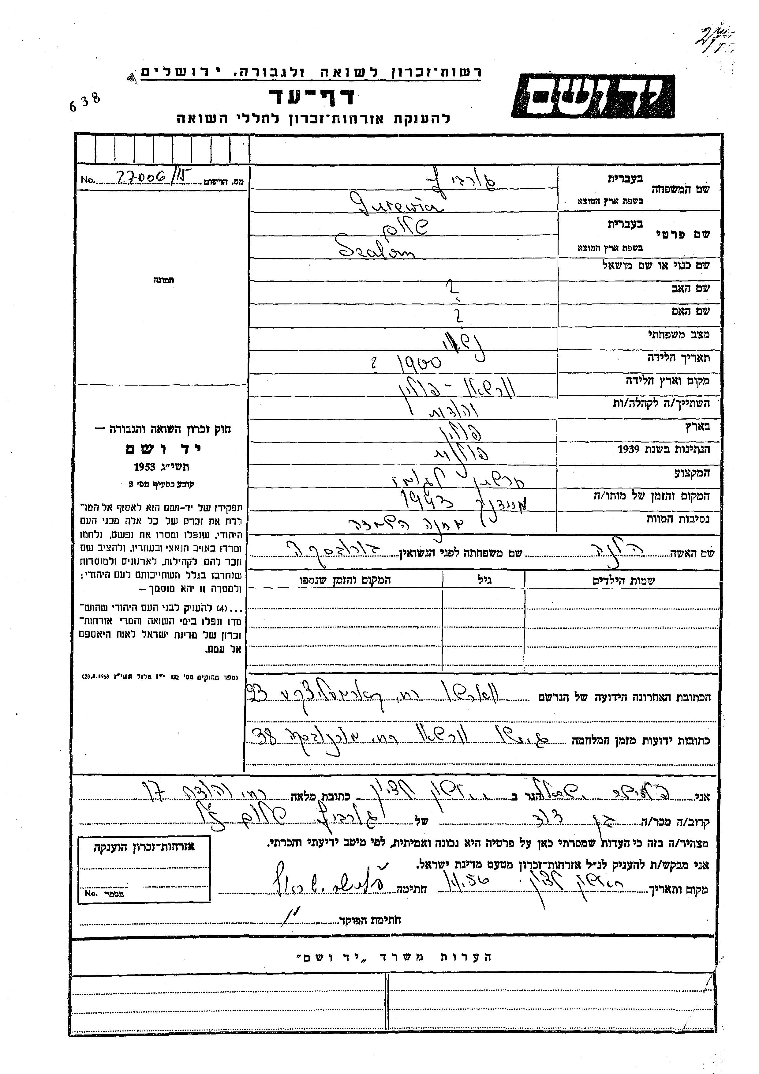 Szalom Gurewicz was born in Warsaw, Poland, 1900. He was a חרשתן גומי. Prior to WWII he lived in Warsaw, Poland. During the war he was in Warsaw, Poland. Szalom was murdered in the Shoah. Place of death: Majdanek, Poland, 1943.