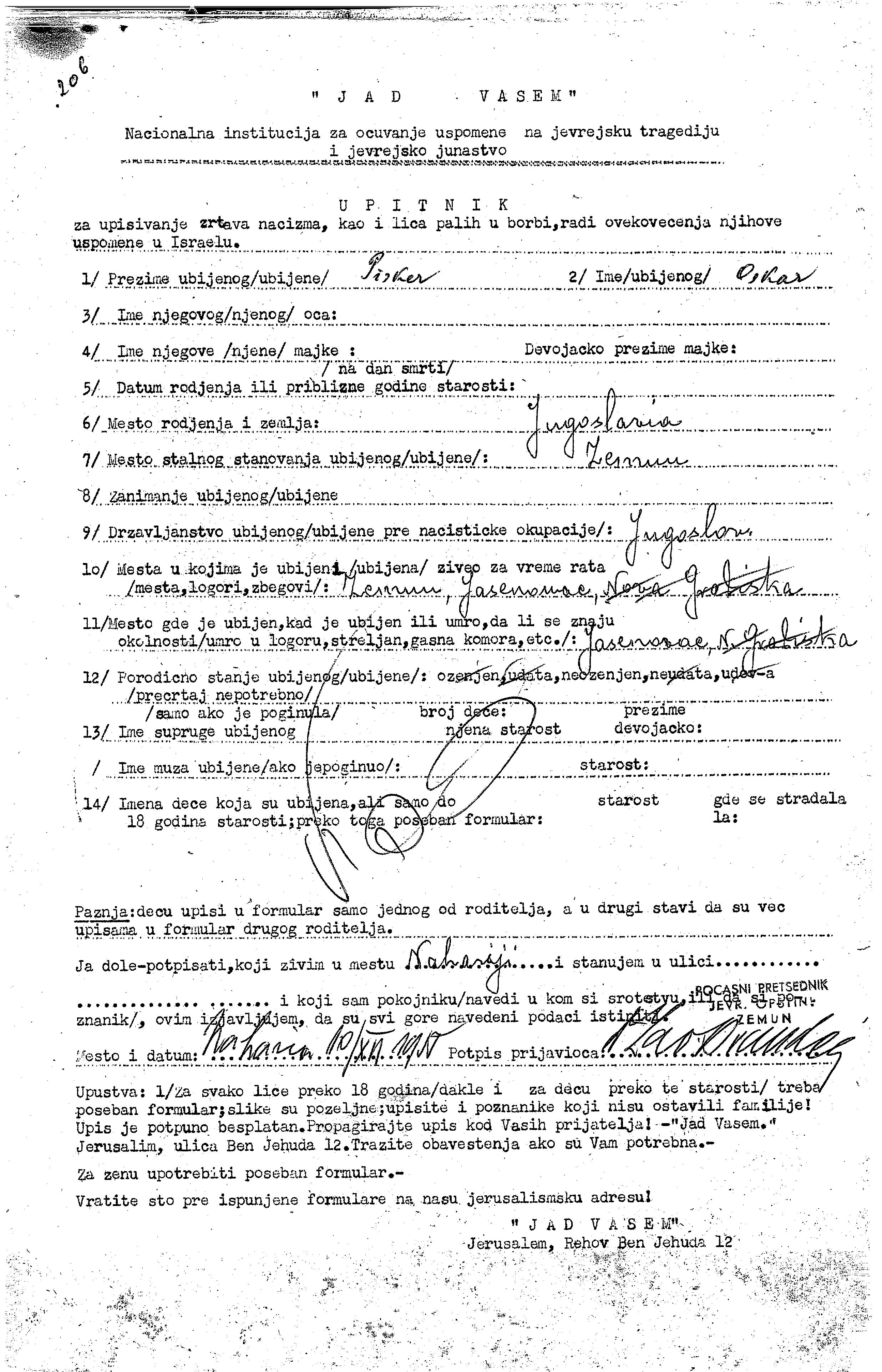 Pisker Oskar Zemun, Yugoslavia Page of Testimony