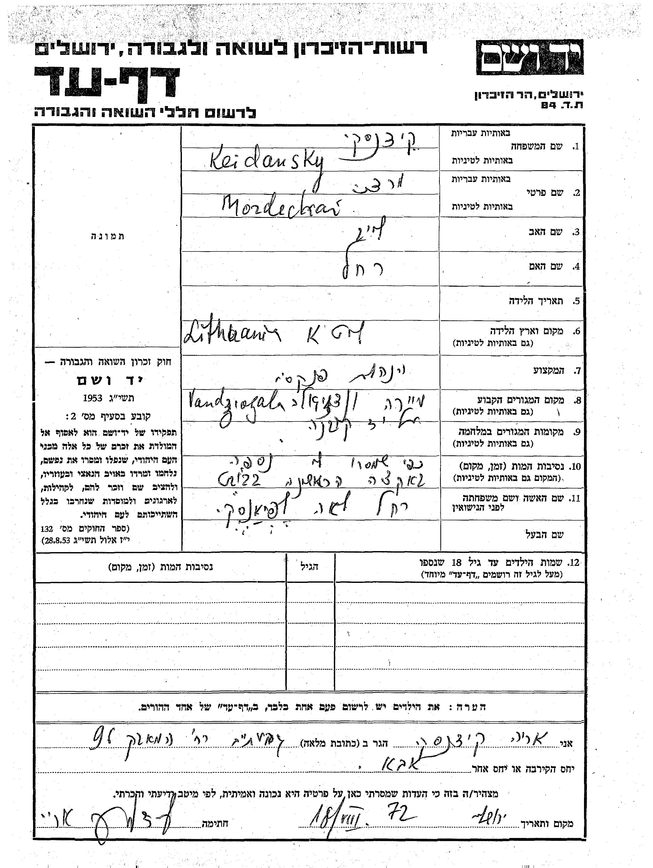 Mordechai Keidansky was born in Lithuania to Leib and Rakhel. He was a bookkeeper and married to Rakhel Lea nee Lepianski. Prior to WWII he lived in Vandžiogala, Lithuania. During the war he was in Kaunas, Lithuania. Mordechai was murdered in the Shoah. Place of death: Babtai, Lithuania.