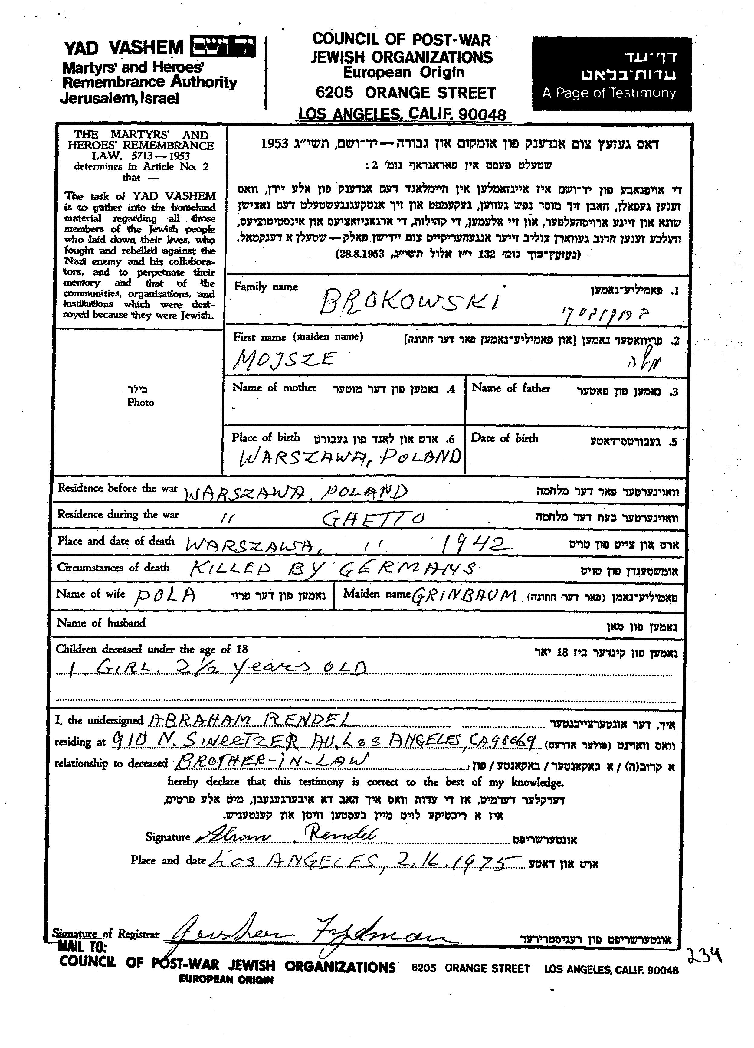First name unknown Brokovski was born to Mojsze and Pola nee Grinbaum. Was child. Prior to WWII lived in Warszawa, Poland. During the war was in Warszawa, Poland. Was murdered in the Shoah.