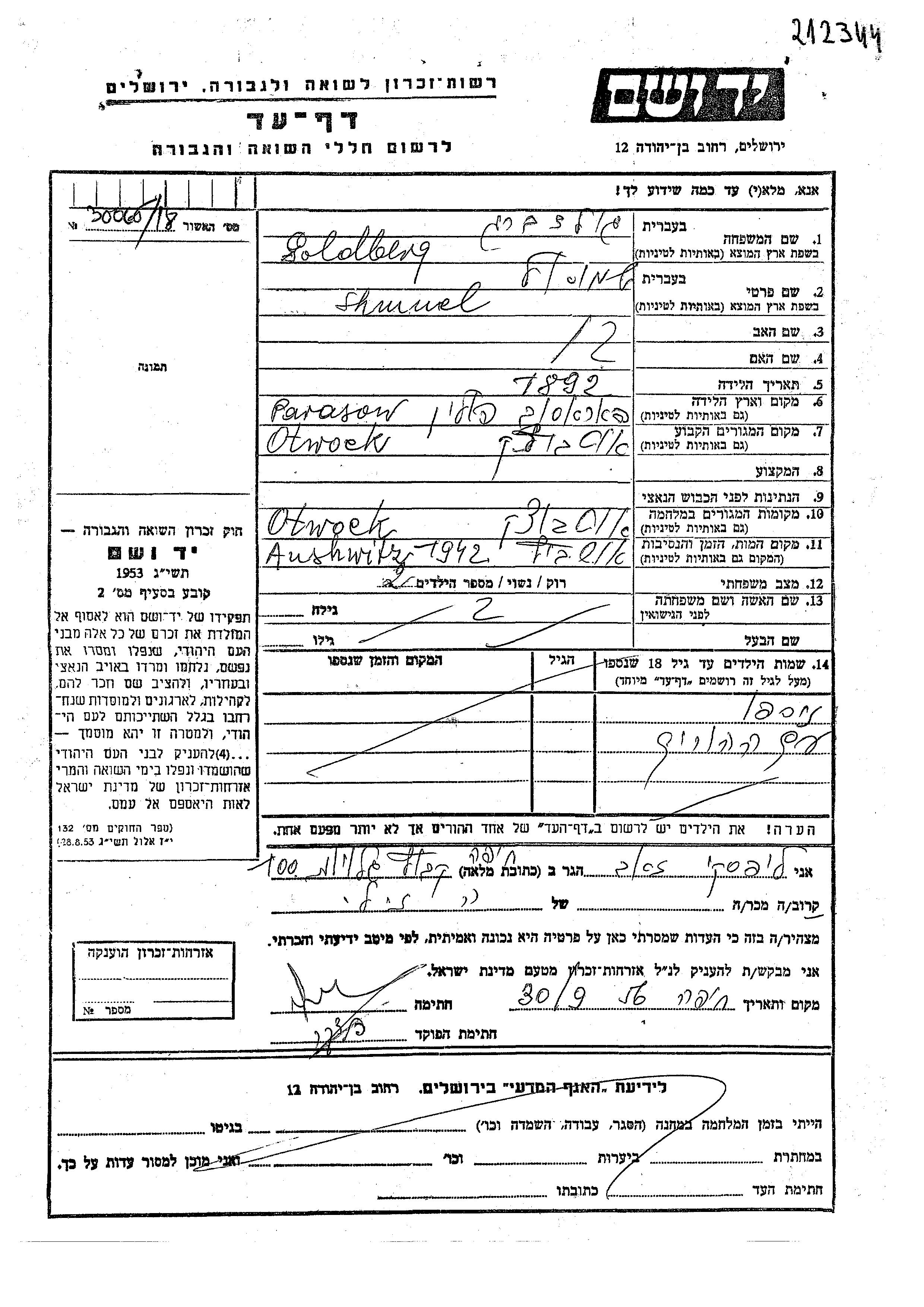 Shmuel Goldberg was born in Parysow, Poland, 1892. He was married. Prior to WWII he lived in Otwock, Poland. During the war he was in Otwock, Poland. Shmuel was murdered in the Shoah. Place of death: Auschwitz, Poland, 1942.