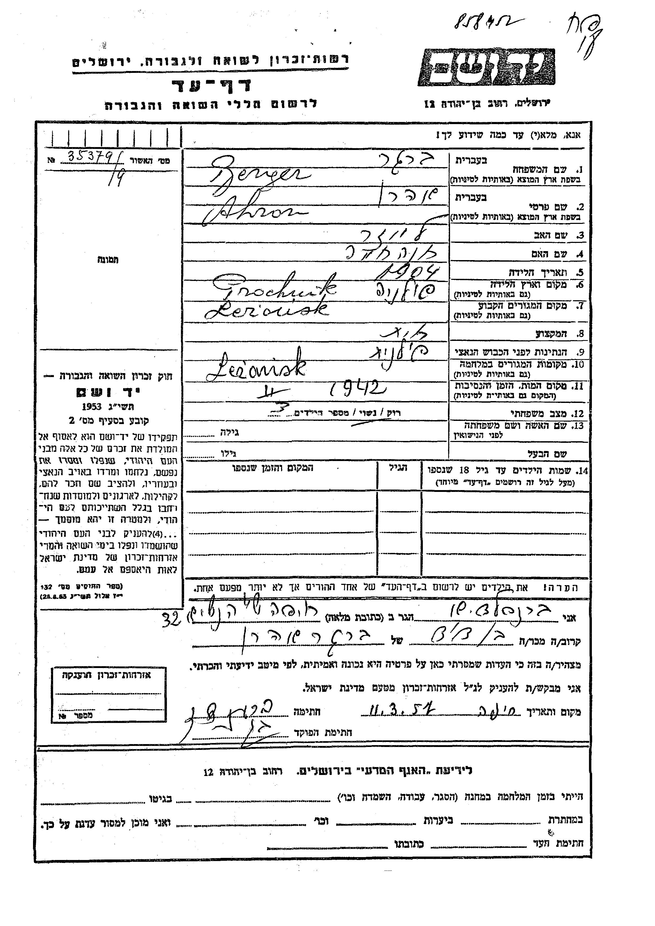 Ahron Berger was born in Prochnik, Poland, 1904 to Leizer and Khana Khava. He was a tailor and married. Prior to WWII he lived in Lezajsk, Poland. During the war he was in Lezajsk, Poland. Ahron was murdered in the Shoah. Place of death: unknown, 1942.