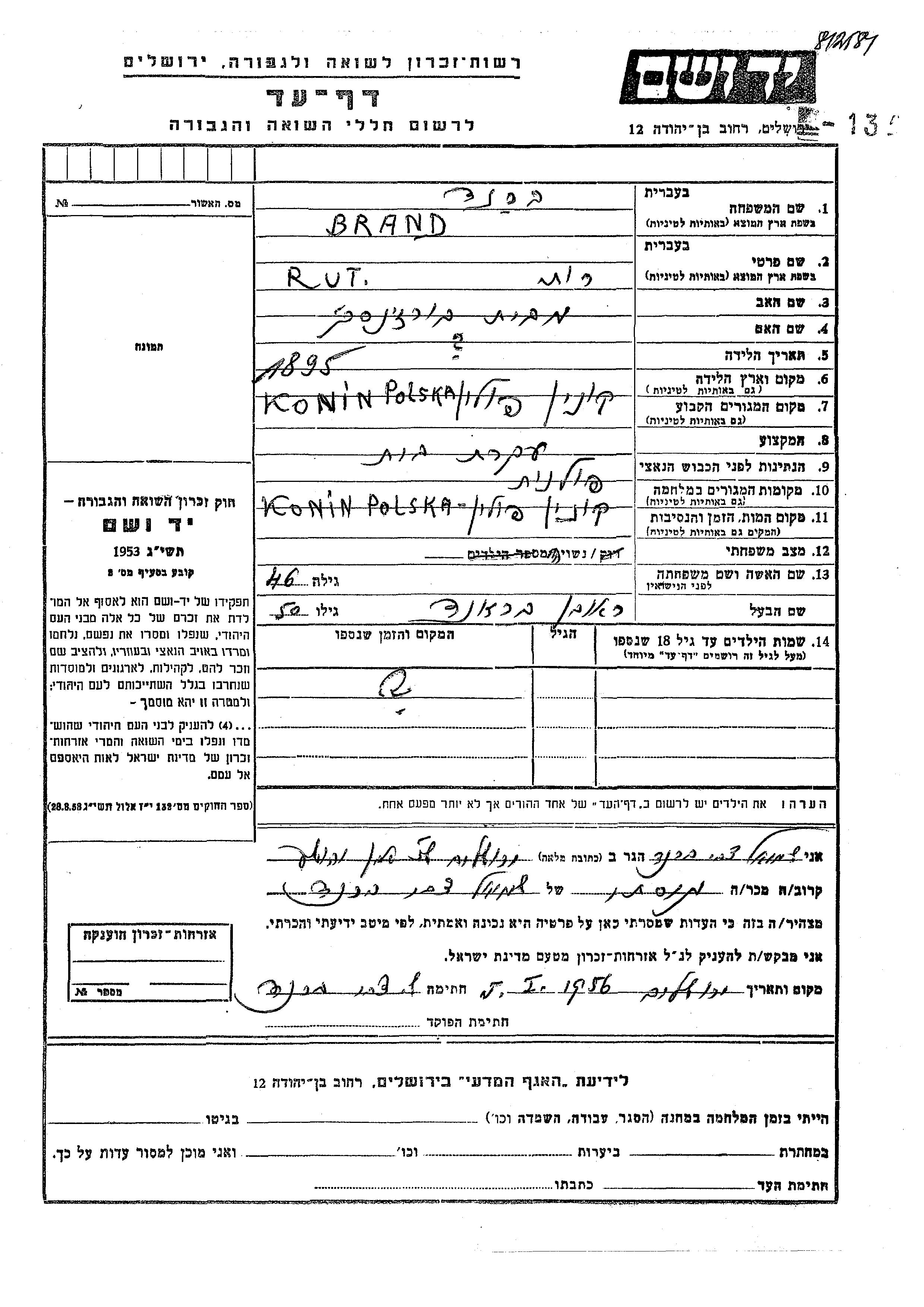 Brand Rut 1895 Konin, Poland Page of Testimony