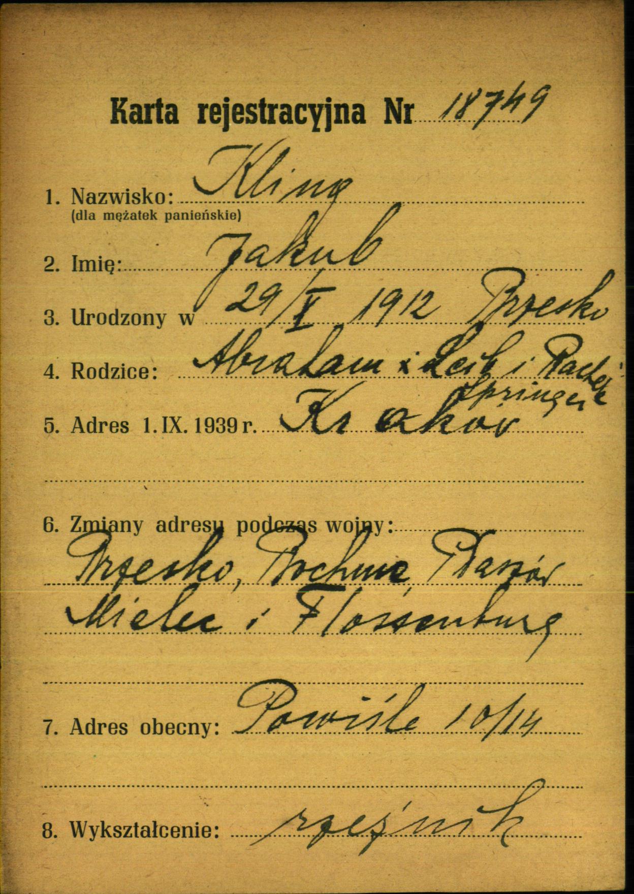 Jakub Kling was born in Brzesko, Poland, 1912 to Abraham Leib and Rachela. He was single. Prior to WWII he lived in Krakow, Poland. During the war he was in Bochnia, Poland. Jakub survived the Shoah.