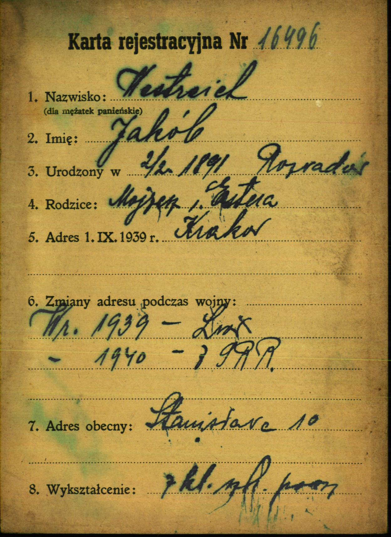 Jakob Westreich was born in Rozwadów, Poland, 1891 to Mojzesz and Estera. He was an industrialist and single. Prior to WWII he lived in Krakow, Poland. During the war he was in Soviet Union. Jakob survived the Shoah.