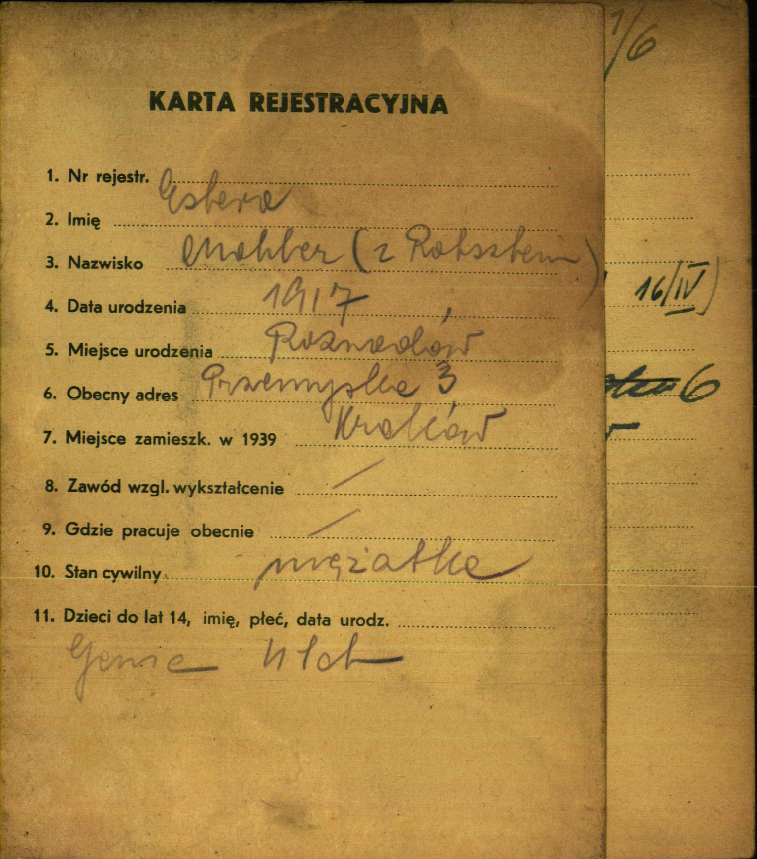 Estera Mahler nee Rotsztein was born in Rozwadów, Poland, 1917. She was married. Prior to WWII she lived in Krakow, Poland.