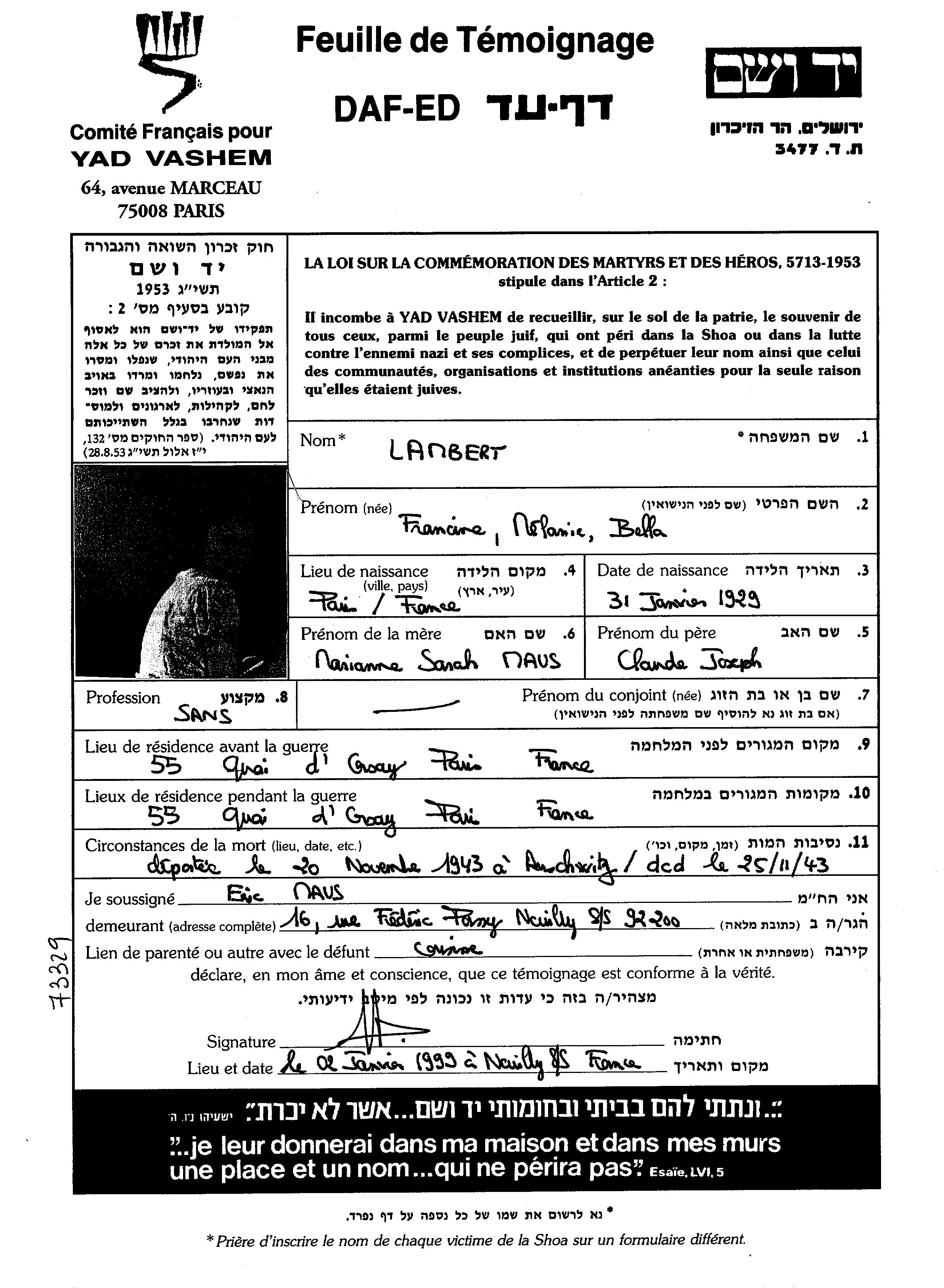 | Lambert | Francine Melania Bella | 1929 | Paris, France | Page of Testimony |