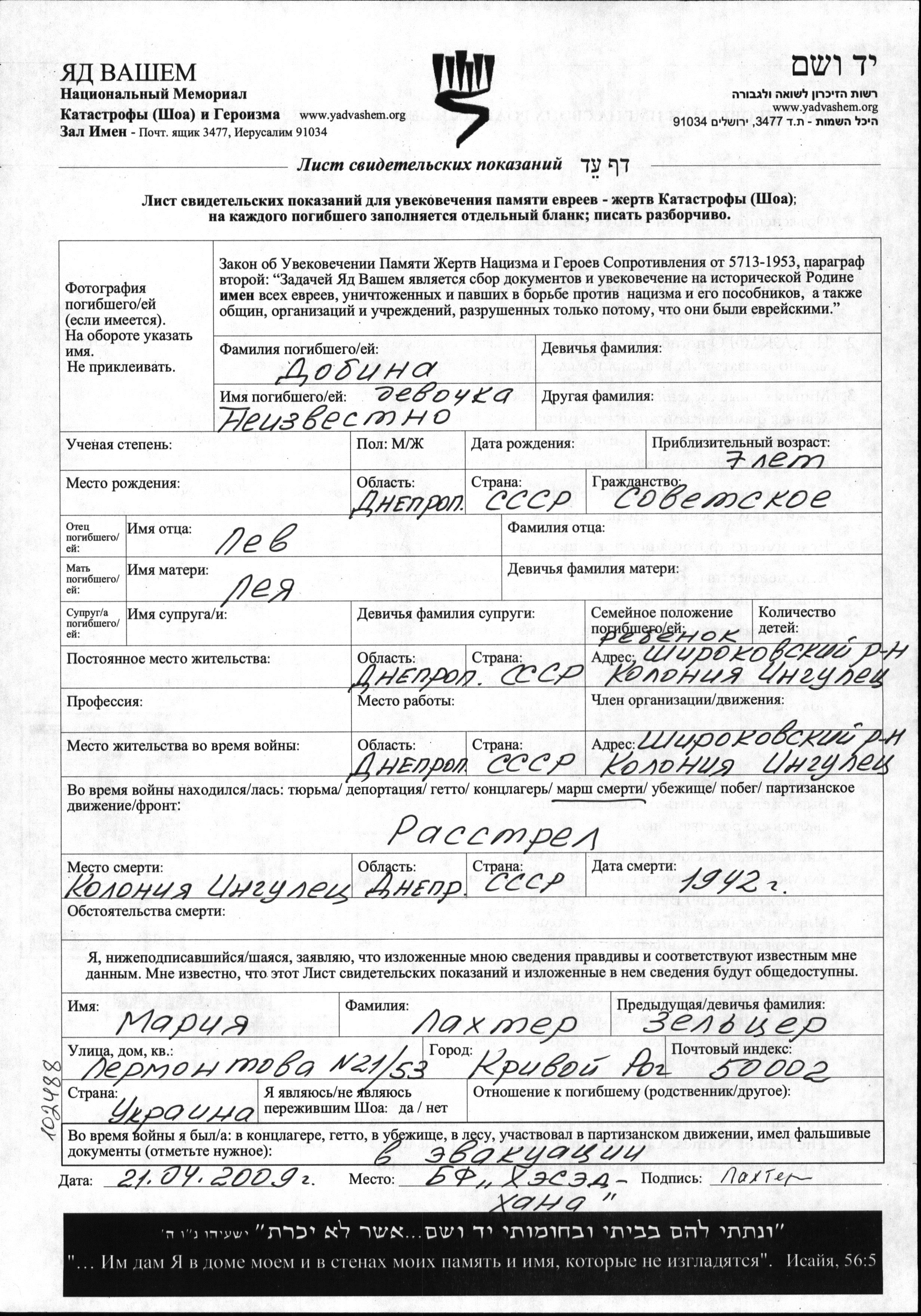 Dobina First name unknown Ingulets, Ukraine (USSR) Page of Testimony