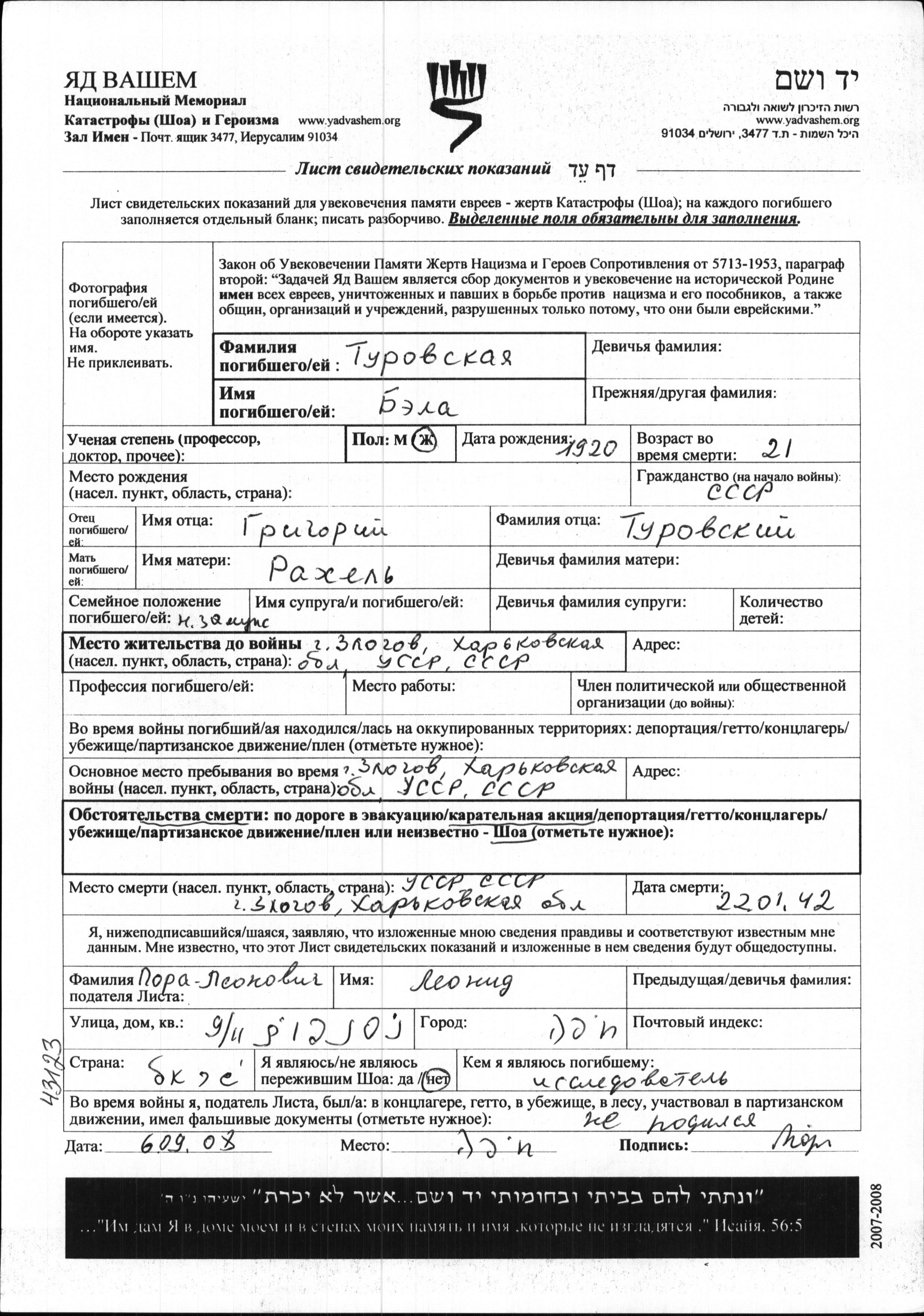 Turovskaya Bela 1920 Zolochev, Ukraine (USSR) Page of Testimony