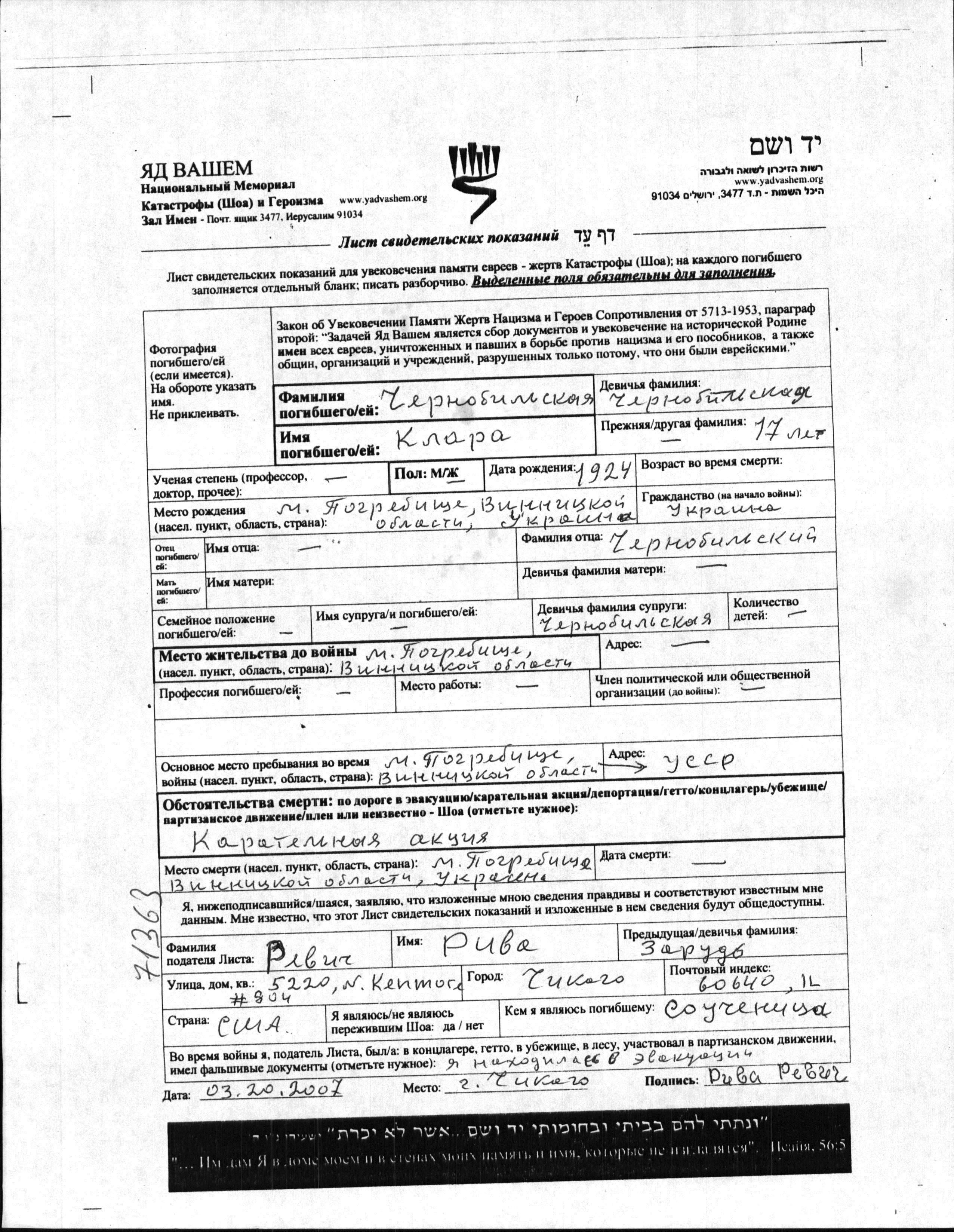 Klara Chernobylskaya was born in Pogrebishche, Ukraine (USSR), 1924. She was teenager. Prior to WWII she lived in Pogrebishche, Ukraine (USSR). During the war she was in Pogrebishche, Ukraine (USSR). Klara was murdered in the Shoah. Place of death: Pogrebishche, Ukraine (USSR).