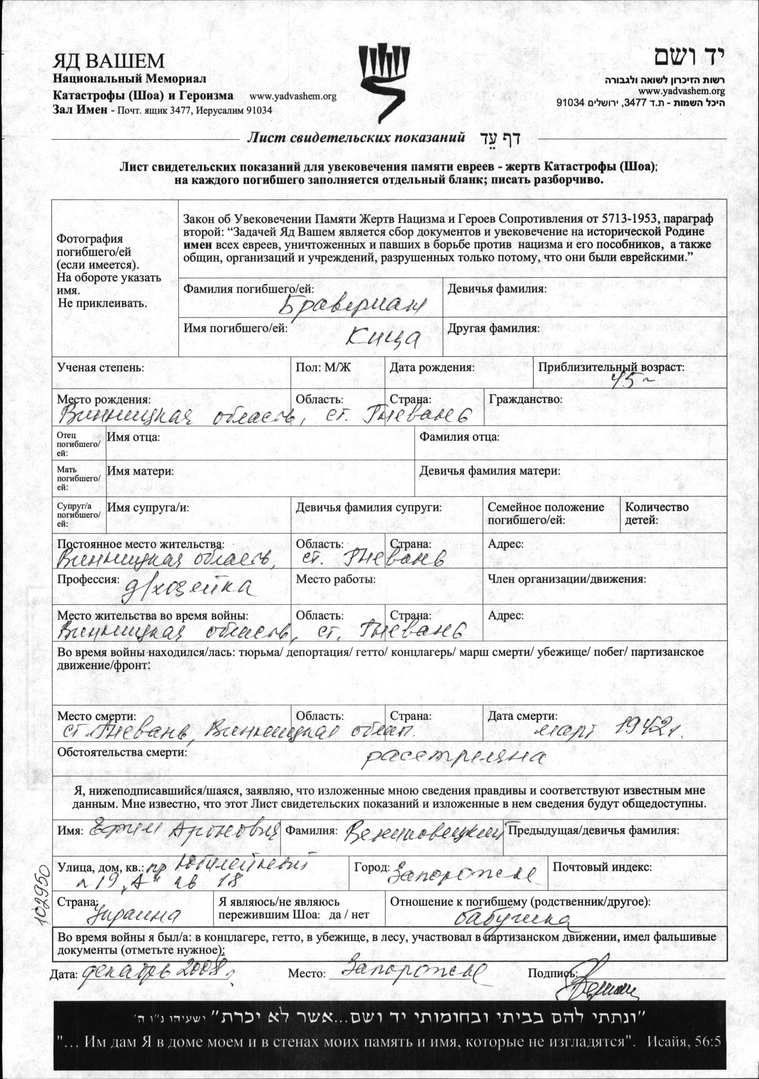 Braverman Kitza Gnivan, Ukraine (USSR) Page of Testimony