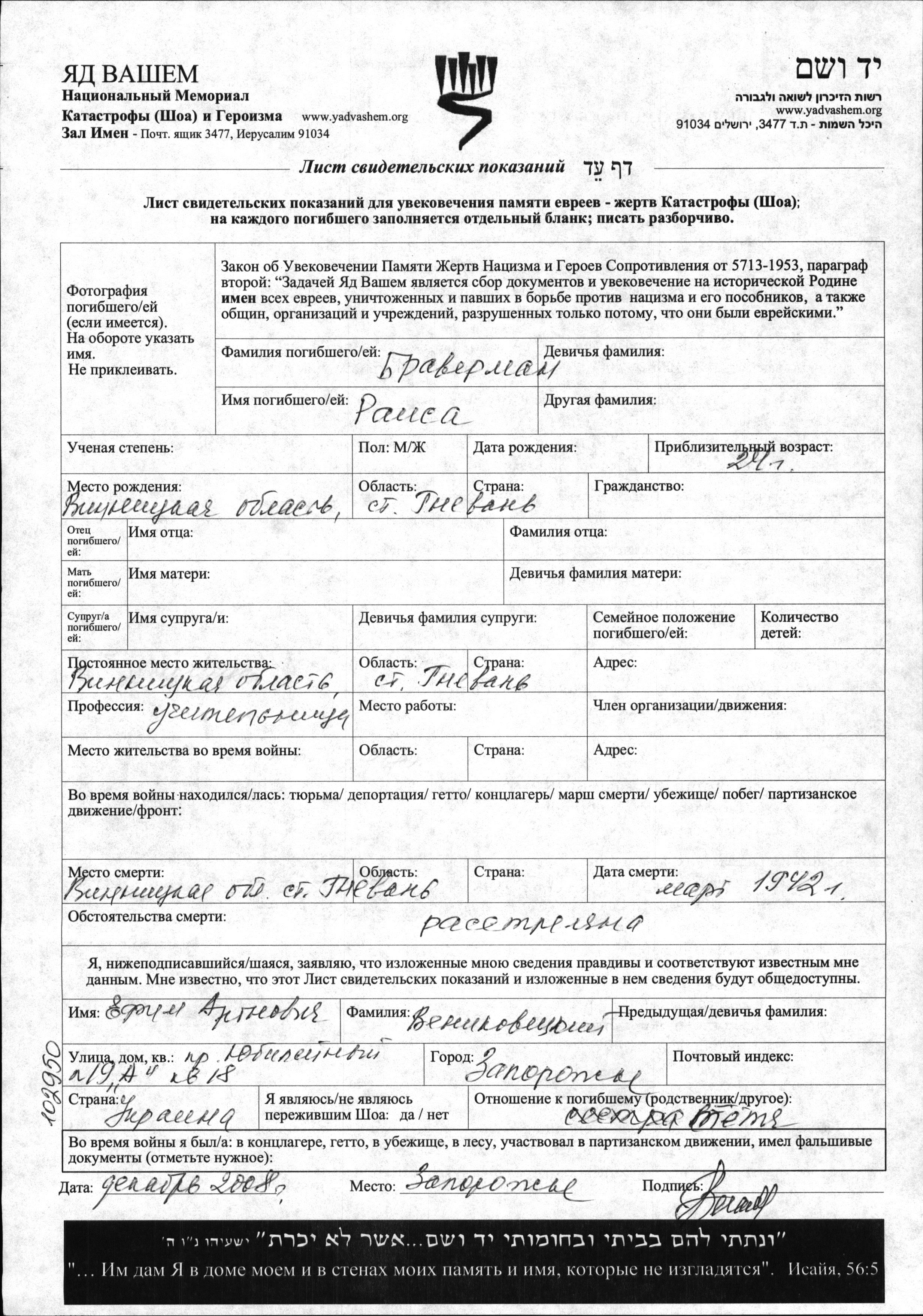 Braverman Raisa Gnivan, Ukraine (USSR) Page of Testimony