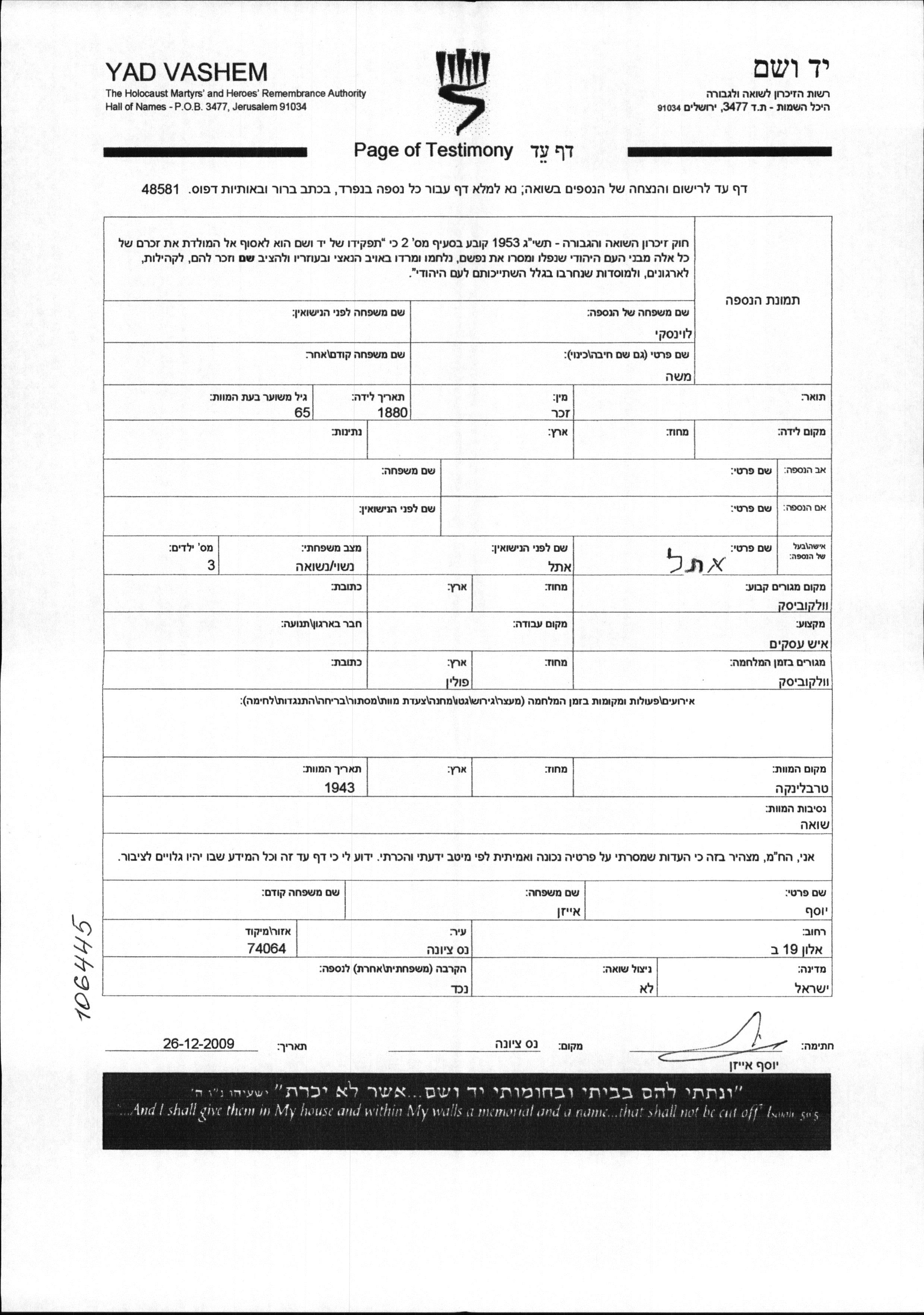 Moshe Levinski was born, 1880. He was a businessman and married. Prior to WWII he lived in Wolkowysk, Poland. During the war he was in Wolkowysk, Poland. Moshe was murdered in the Shoah. Place of death: Treblinka, Poland, 1943.