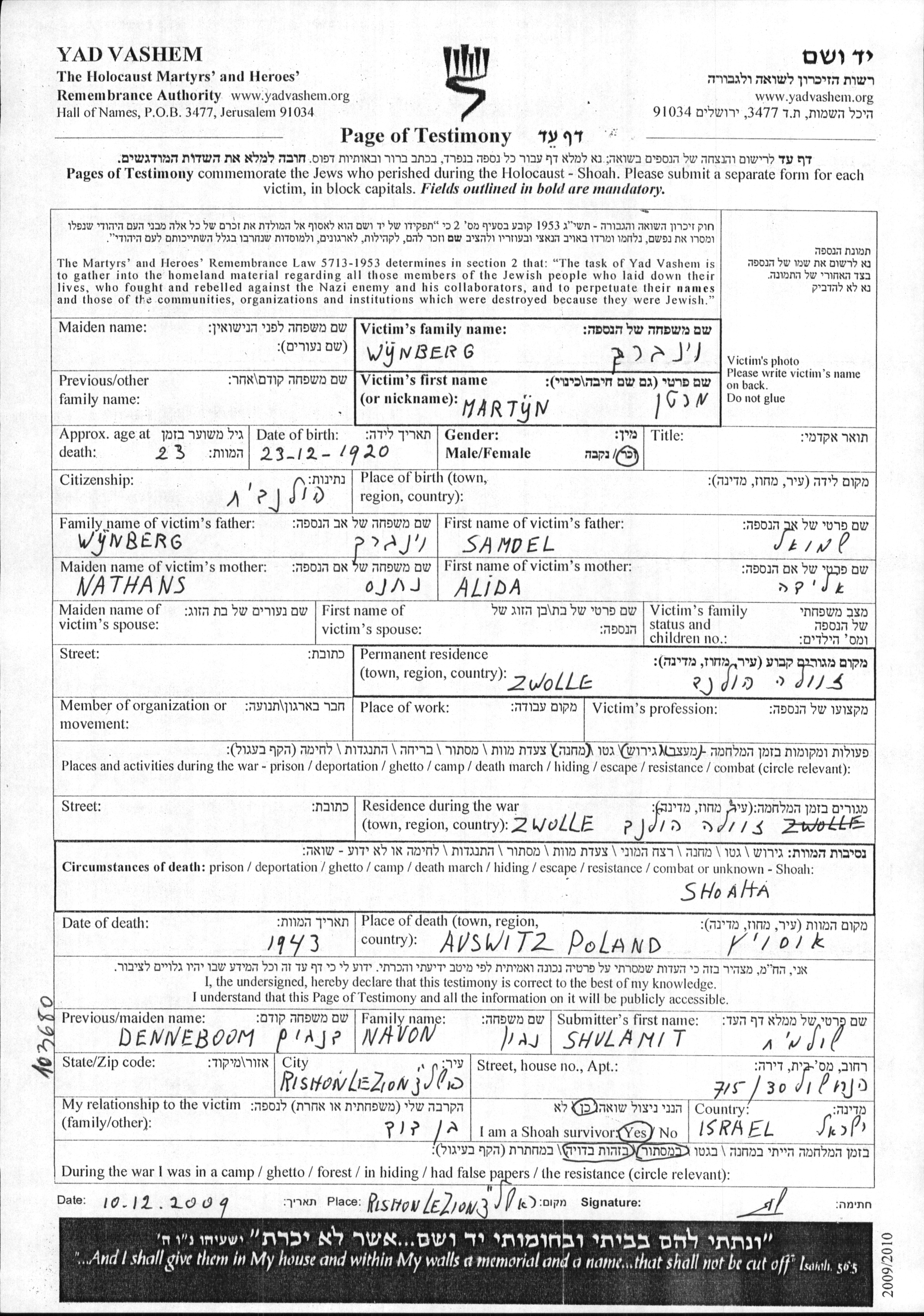 Wynberg Martyn 1920 Zwolle, The Netherlands Page of Testimony