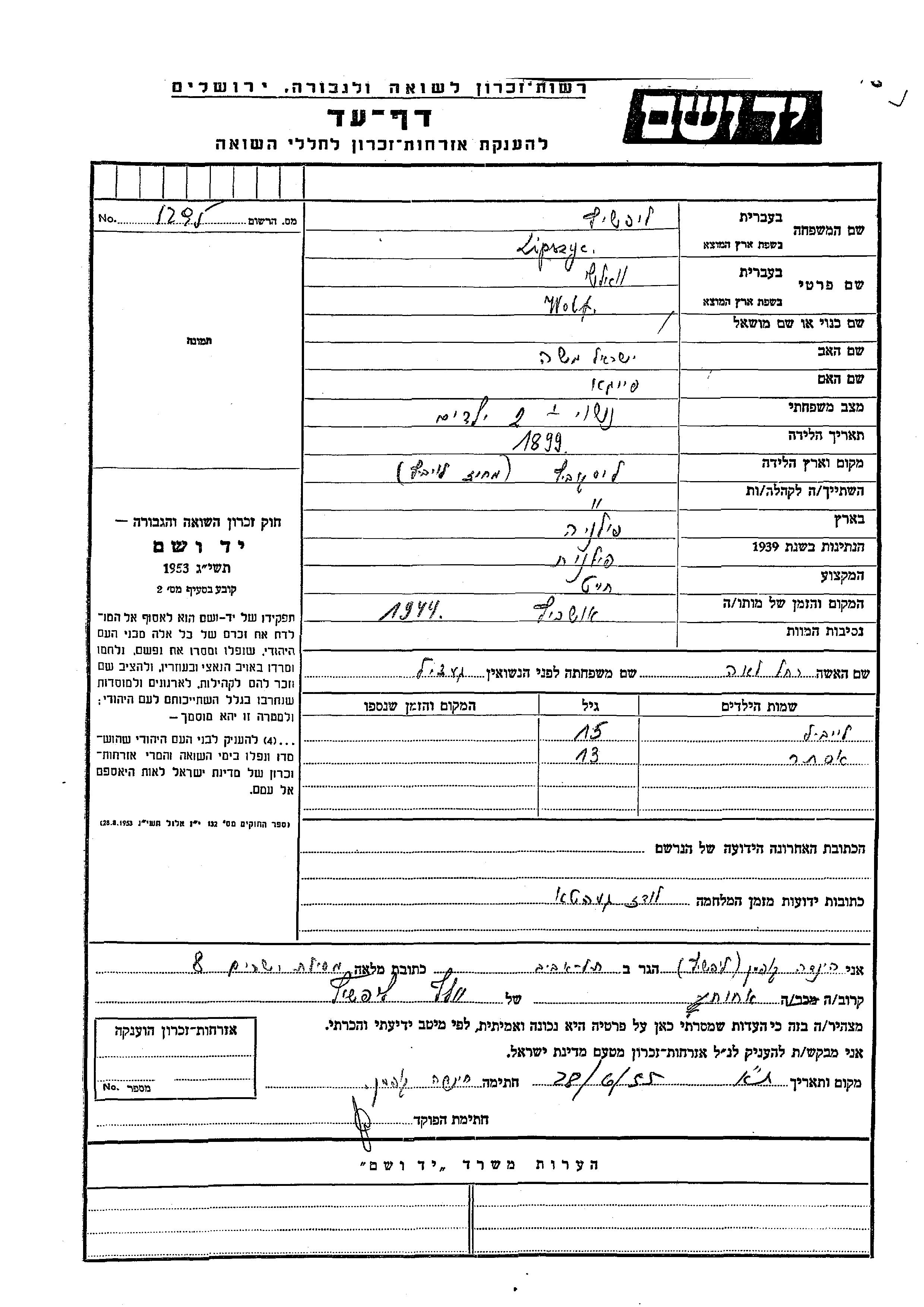 Wolf Lipszyc was born in Lyszkowice, Poland, 1899 to Yisrael Moshe and Feiga. He was a tailor and married to Rakhel Lea nee Getzel. Prior to WWII he lived in Lyszkowice, Poland. During the war he was in Lodz, Poland. Wolf was murdered in the Shoah. Place of death: Auschwitz, Poland, 1944.