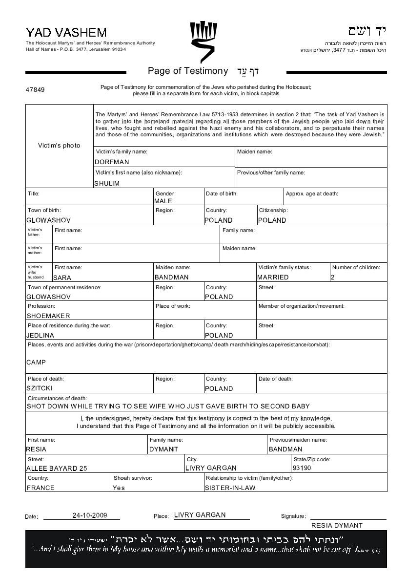 Shulim Dorfman was born in Glowaczow, Poland. He was a shoemaker and married to Sara nee Bandman. Prior to WWII he lived in Glowaczow, Poland. During the war he was in Jedlnia, Poland. Shulim was murdered in the Shoah. Place of death: Siczki, Poland.