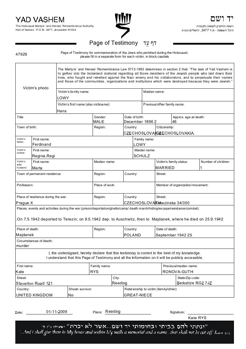 Hans Lowy was born in Czechoslovakia, 1896 to Ferdinand and Regina nee Schulz. He was married to Marta. During the war he was in Prague, Czechoslovakia. Hans was murdered in the Shoah. Place of death: Majdanek, Poland, 25/09/1942.