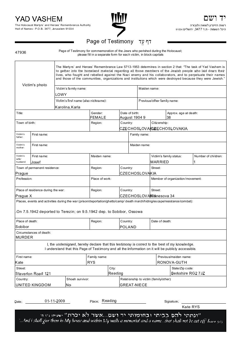 Karolina Karla Lowy was born, 1904. She was married to Josef. Prior to WWII she lived in Prague, Czechoslovakia. During the war she was in Prague, Czechoslovakia. Karolina Karla was murdered in the Shoah. Place of death: Sobibor, Poland.