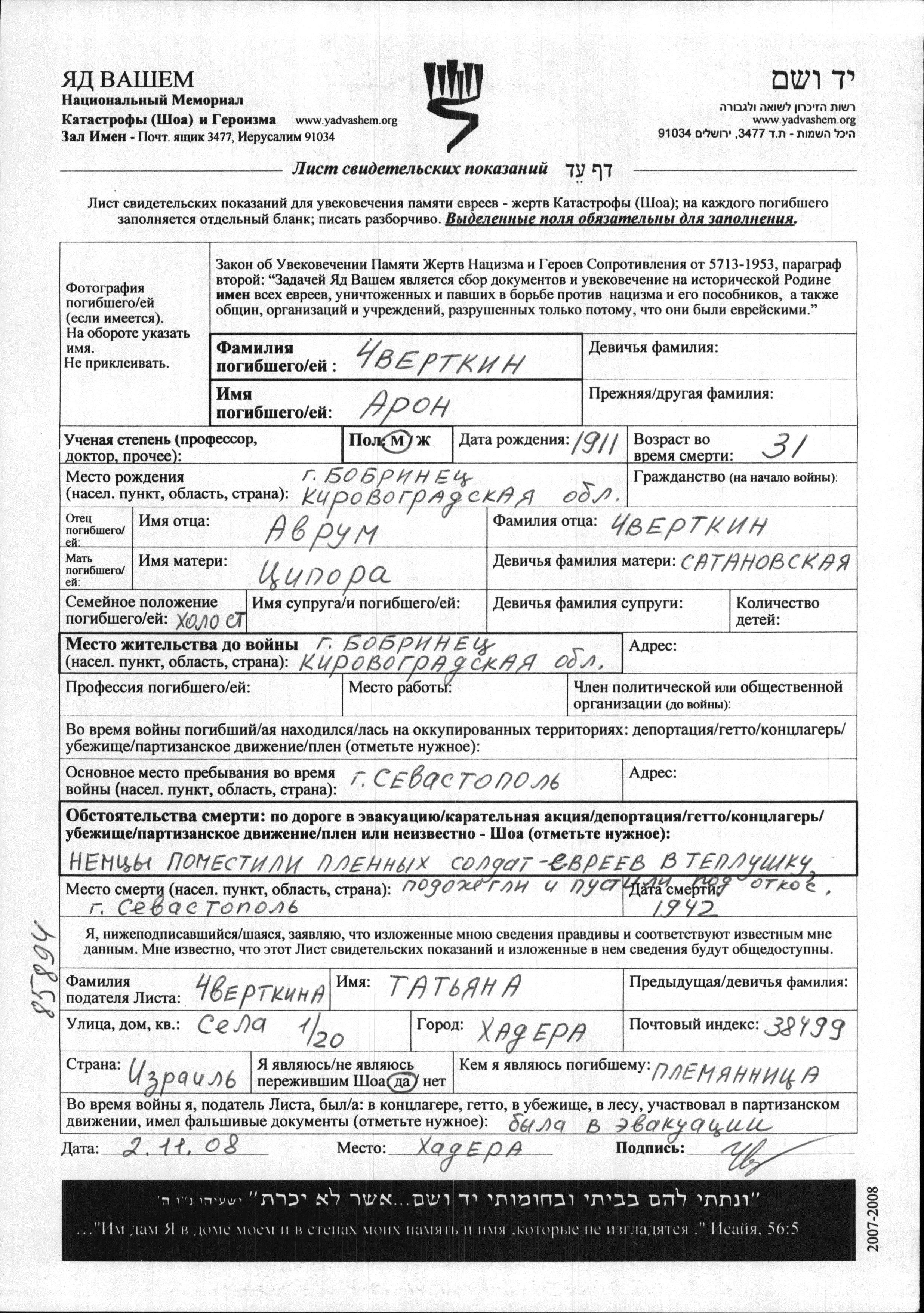 Aron Chvertkin was born in Bobrinets, Ukraine (USSR), 1911 to Avrum and Tzipora nee Satanovskaya. He was single. Prior to WWII he lived in Bobrinets, Ukraine (USSR). During the war he was in the Soviet armed forces. Aron was murdered in the Shoah. Place of death: Sevastopol, Russia (USSR), 1942.