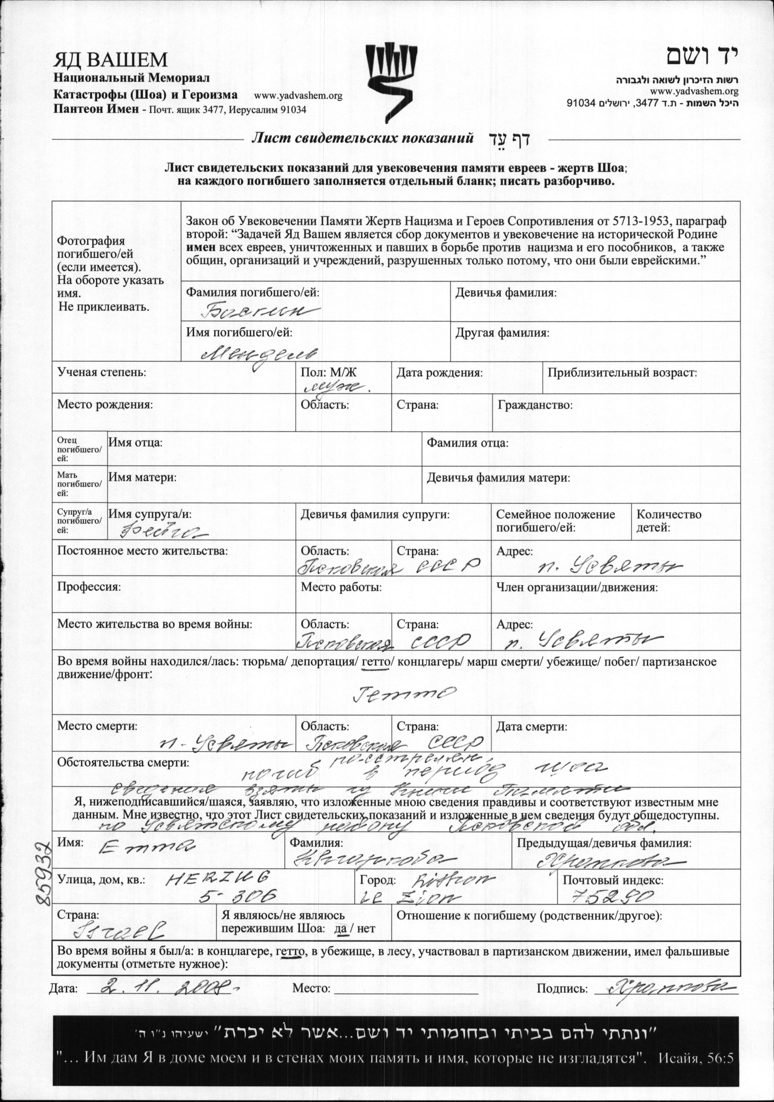 Mendel Baskin. He was married to Feiga. Prior to WWII he lived in Usvyaty, Russia (USSR). During the war he was in Ghetto. Mendel was murdered in the Shoah. Place of death: Usvyaty, Russia (USSR).
