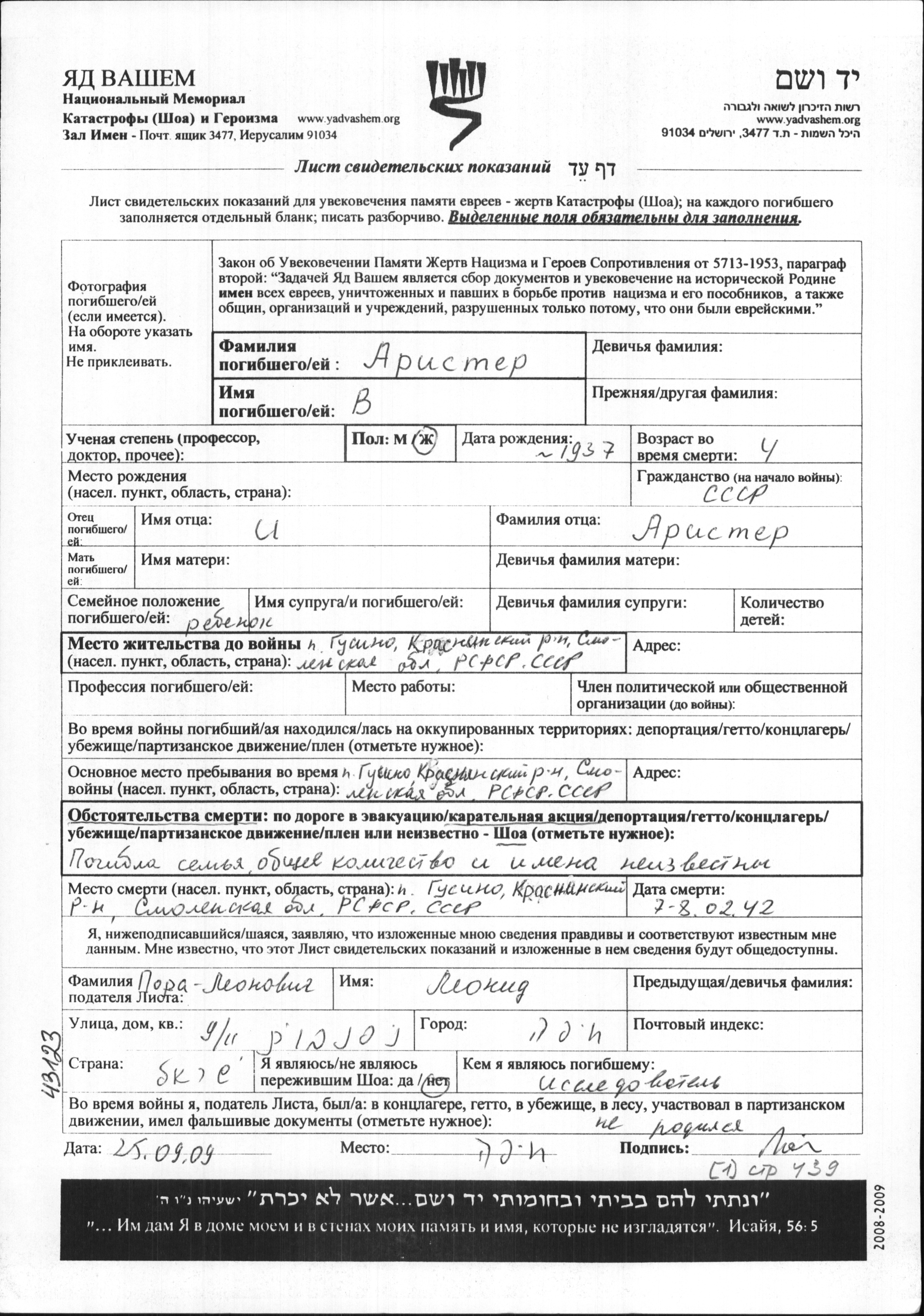 Arister V 1937 Gusino, Russia (USSR) Page of Testimony